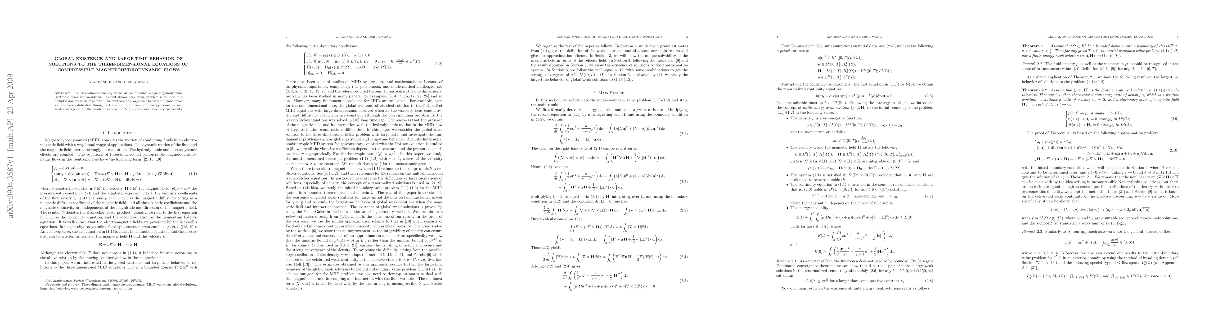 This paper establishes the global existence and long-term behavior of weak solutions to three-dimensional compressible magnetohydrodynamic isentropic flow equations using a three-level approximation and energy estimates for $\gamma > \frac{3}{2}$ and constant viscosity coefficients. The study focuses on initial-boundary value problems in bounded domains with large initial data.
