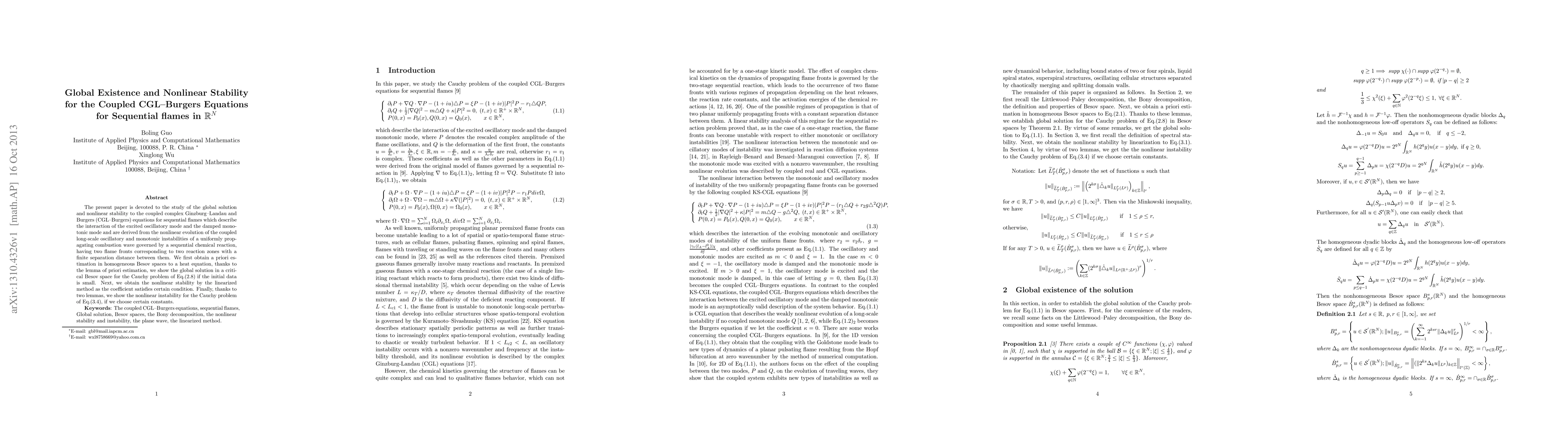 Summary: This paper investigates the global existence and nonlinear stability of solutions to the coupled complex Ginzburg Landau and Burgers equations, which model sequential flames in an N-dimensional space. The study focuses on the behavior and stability of these solutions over time.