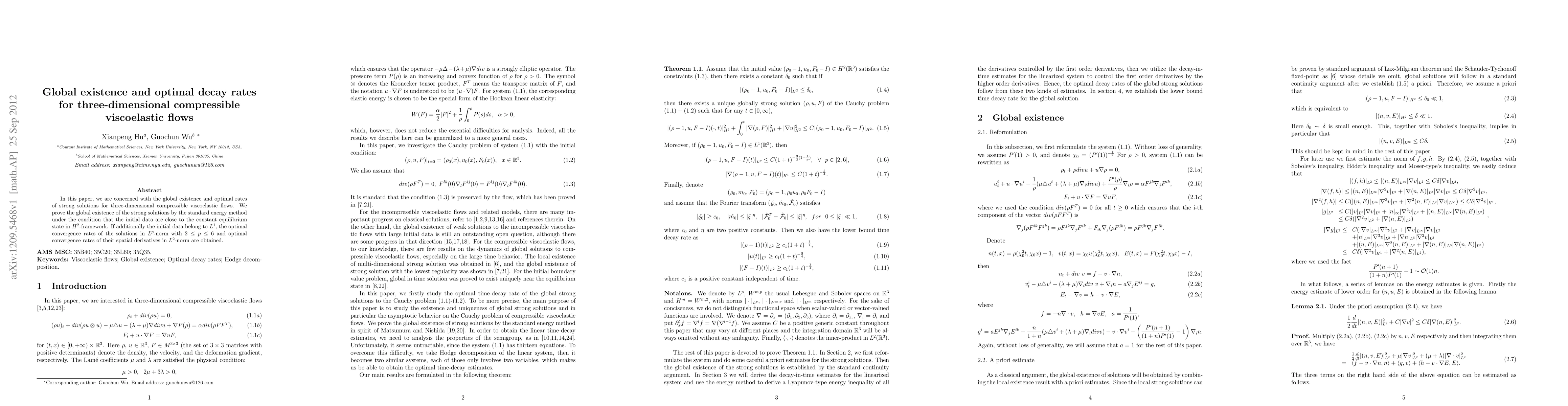This paper investigates the global existence and optimal decay rates of strong solutions for three-dimensional compressible viscoelastic flows. It proves global existence using the energy method for initial data near equilibrium in an $H^2$-framework, and achieves optimal convergence rates in $L^p$ and $L^2$ norms for $L^1$ initial data.