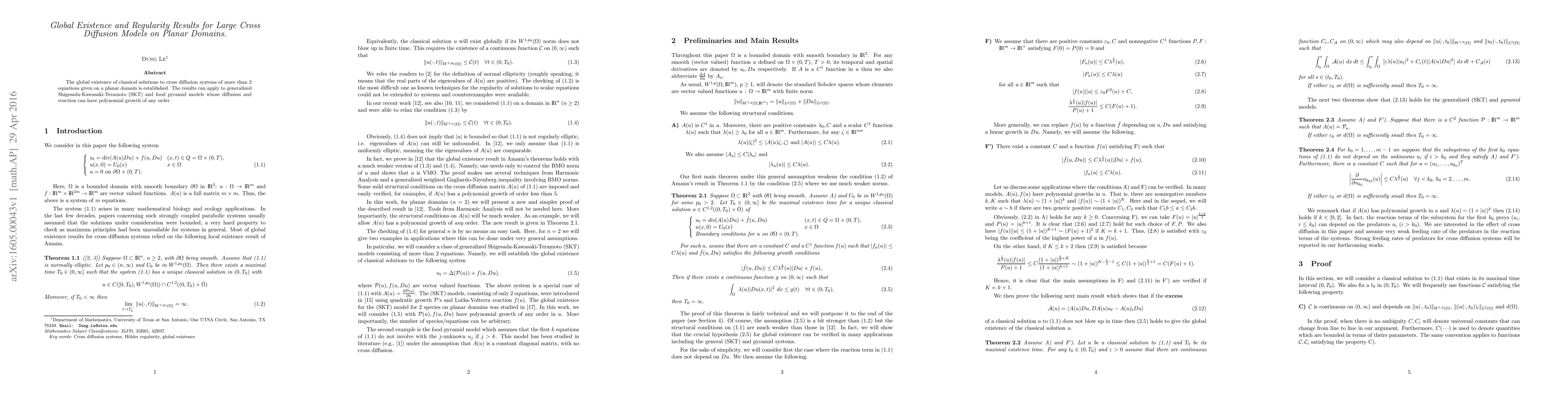 Summary: This paper establishes global existence and regularity for classical solutions to cross diffusion systems with more than two equations on planar domains, applicable to generalized SKT and food pyramid models with polynomial growth of any order. The results provide a comprehensive analysis of these complex systems.