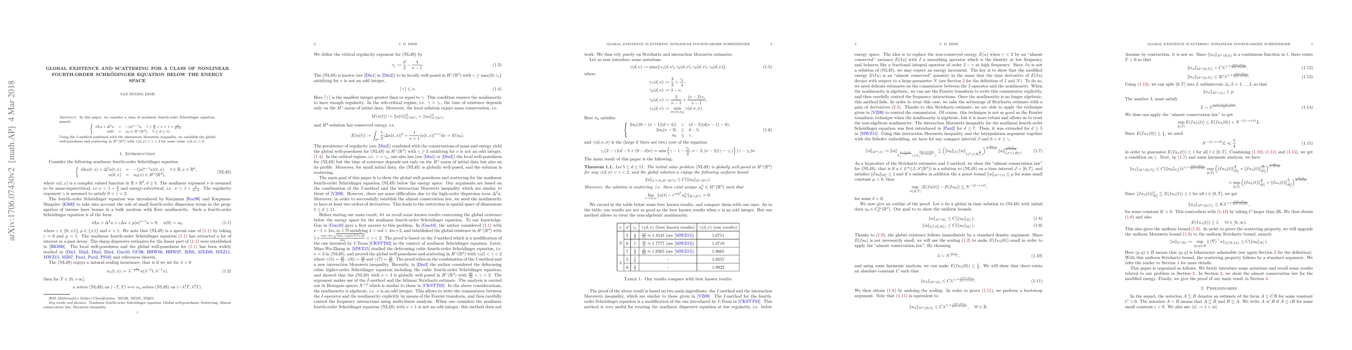 This research proves global well-posedness and scattering for a specific class of nonlinear, fourth-order Schrödinger equations below the energy space, using the I-method and interaction Morawetz inequality. The findings apply for certain dimensions (5 ≤ d ≤ 11) and power values (1+8/d < ν < 1+8/d-4) of the nonlinearity.