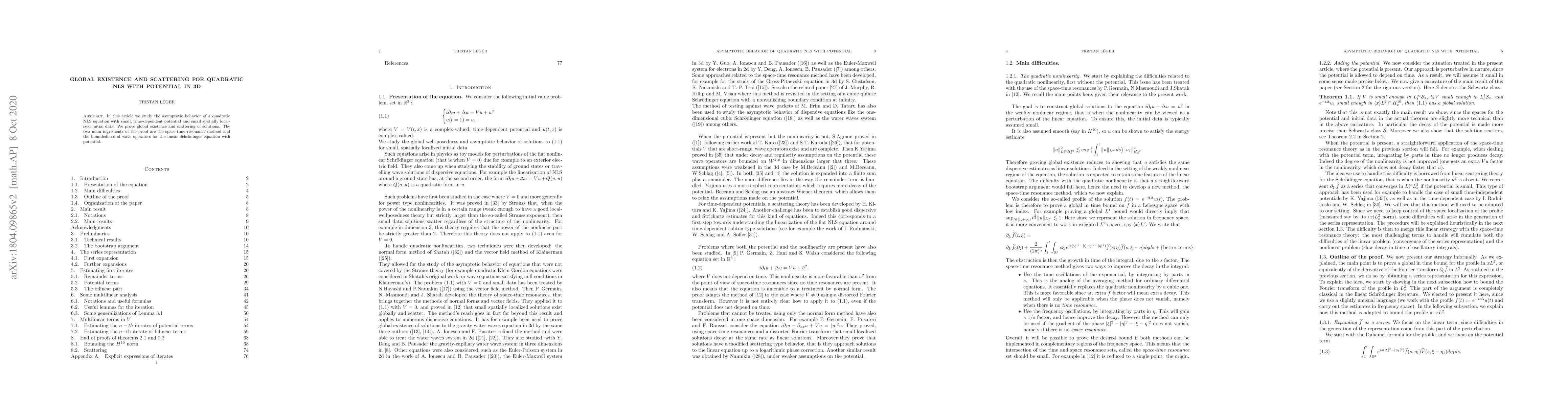 Researchers prove global existence and scattering of solutions for a quadratic nonlinear Schrödinger equation with small time-dependent potential and localized initial data.