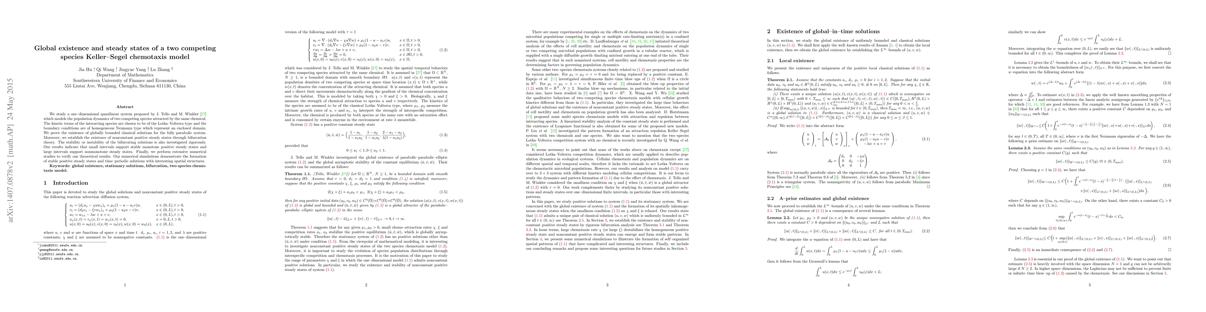 Researchers prove the existence of global solutions for a model of two competing species attracted to the same chemical, establishing conditions under which non-constant steady states emerge with varying spatial structures.