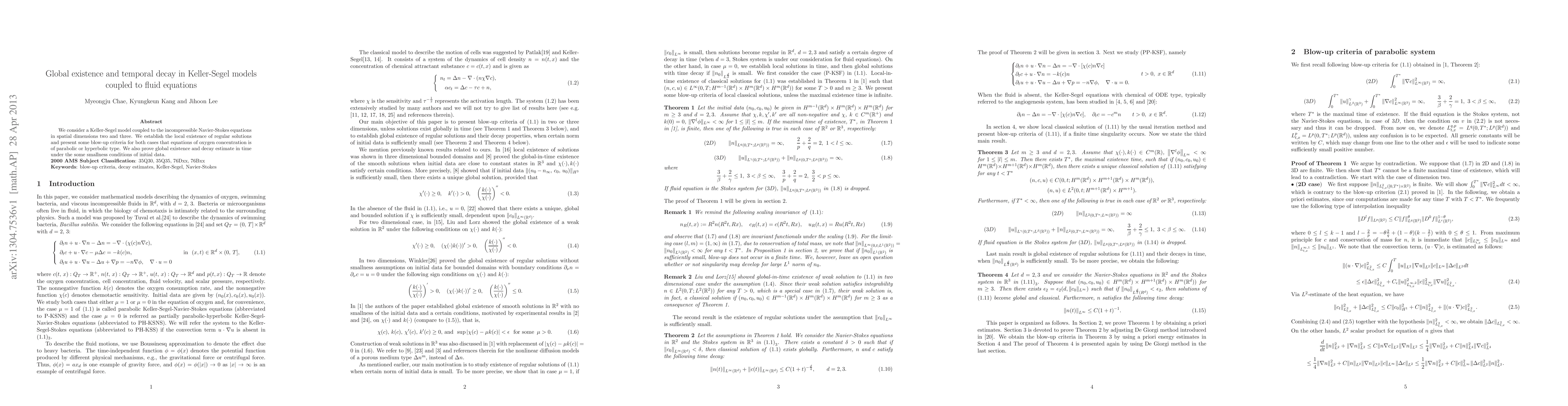 Summary: This paper investigates a coupled Keller-Segel and Navier-Stokes model in two and three dimensions, establishing local existence and blow-up criteria for different types of oxygen concentration equations. It also proves global existence and temporal decay under specific smallness conditions on initial data.