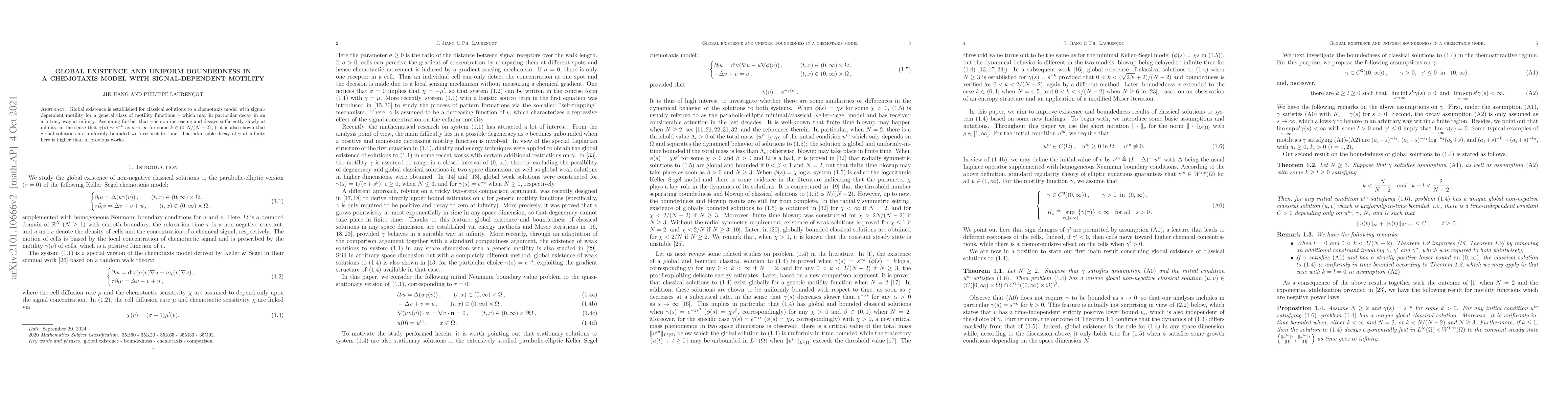 Global existence is established for classical solutions to a chemotaxis model with signal-dependent motility for a general class of motility functions $\gamma$ which may in particular decay in an arbitrary way at infinity. Assuming further that $\gamma$ is non-increasing and decays sufficiently slowly at infinity, in the sense that $\gamma(s)\sim s^{-k}$ as $s\to\infty$ for some $k\in (0,N/(N-2)_+)$, it is also shown that global solutions are uniformly bounded with respect to time. The admissible decay of $\gamma$ at infinity here is higher than in previous works.