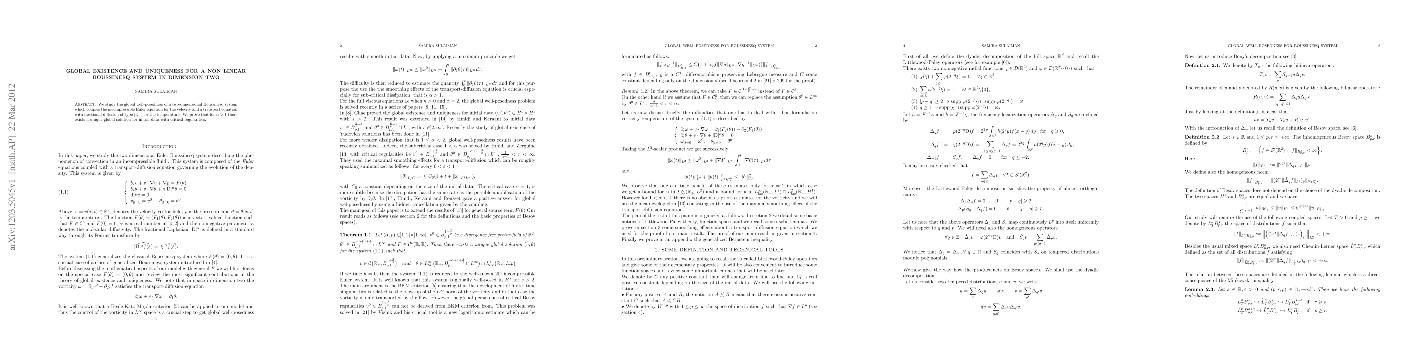 We study the global well-posedness of a two-dimensional Boussinesq system which couples the incompressible Euler equation for the velocity and a transport equation with fractional diffusion of type $|\DD|^{\alpha}$ for the temperature. We prove that for $\alpha>1,$ there exists a unique global solution for initial data with critical regularities.