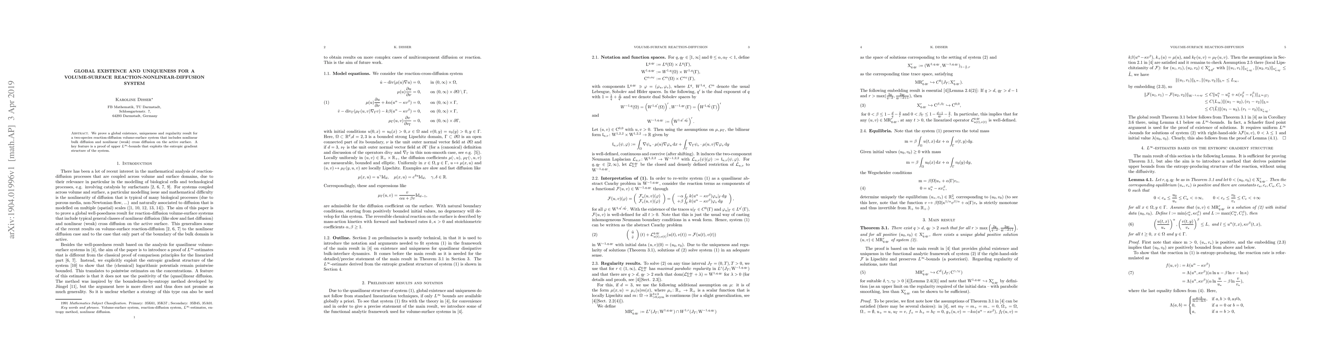 This paper proves global existence, uniqueness, and regularity for a two-species reaction-diffusion system with nonlinear bulk and surface diffusion, leveraging entropic gradient structure to establish upper $L^{\infty}$-bounds. The approach highlights the interplay between volume and surface dynamics in the system.