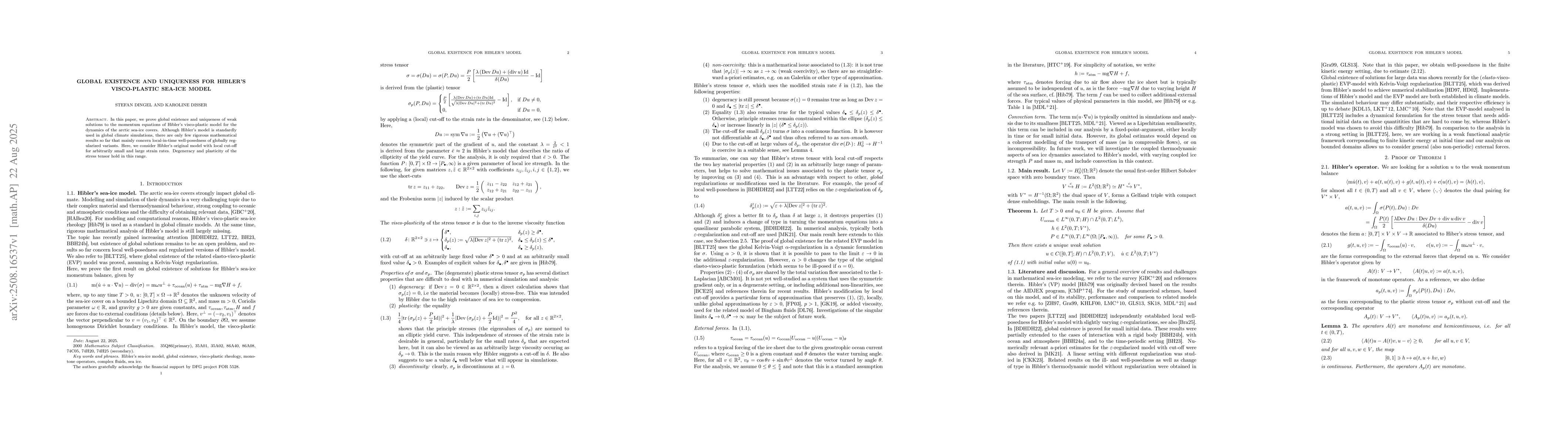 In this paper, we prove global existence and uniqueness of weak solutions to the momentum equations of Hibler's visco-plastic model for the dynamics of the arctic sea-ice covers. Although Hibler's model is standardly used in global climate simulations, there are only few rigorous mathematical results so far that mainly concern local-in-time well-posedness of globally regularized variants. Here, we consider Hibler's original model with local cut-off for arbitrarily small and large strain rates. Degeneracy and plasticity of the stress tensor hold in this range.