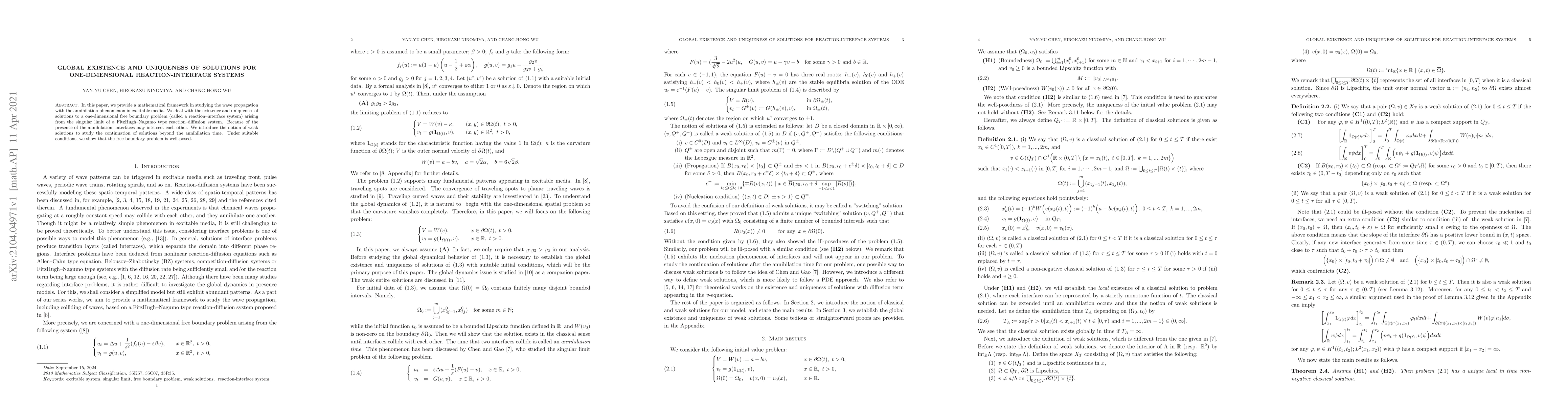 In this paper, we provide a mathematical framework in studying the wave propagation with the annihilation phenomenon in excitable media. We deal with the existence and uniqueness of solutions to a one-dimensional free boundary problem (called a reaction--interface system) arising from the singular limit of a FitzHugh--Nagumo type reaction--diffusion system. Because of the presence of the annihilation, interfaces may intersect each other. We introduce the notion of weak solutions to study the continuation of solutions beyond the annihilation time. Under suitable conditions, we show that the free boundary problem is well-posed.