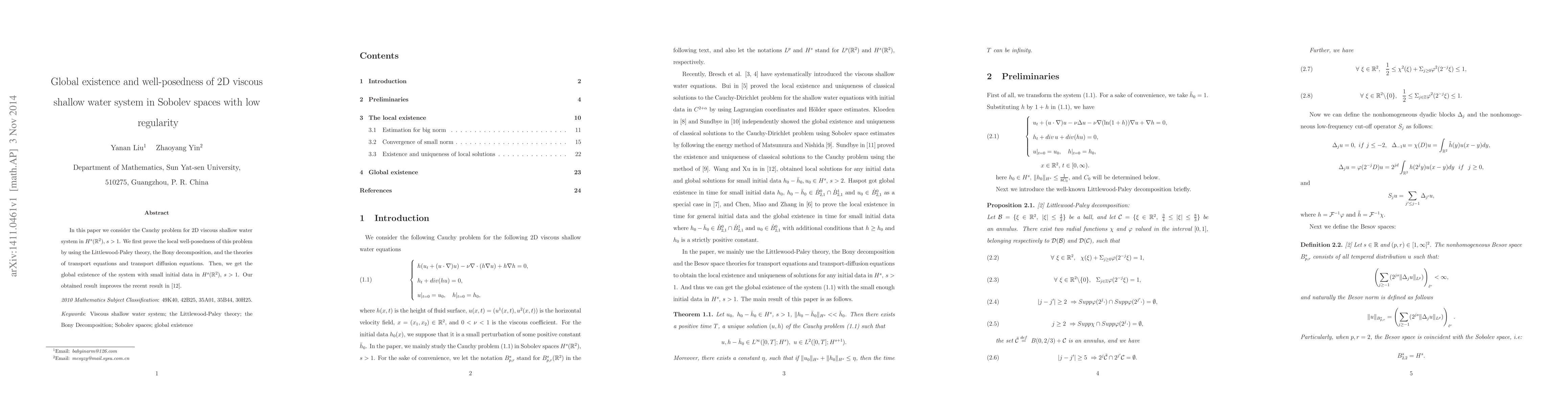 This paper proves local well-posedness and global existence for the 2D viscous shallow water system in Sobolev spaces $H^s(\mathbb{R}^2)$ with $s>1$, using advanced techniques like Littlewood-Paley theory and Bony decomposition. The results improve upon recent findings in the field.
