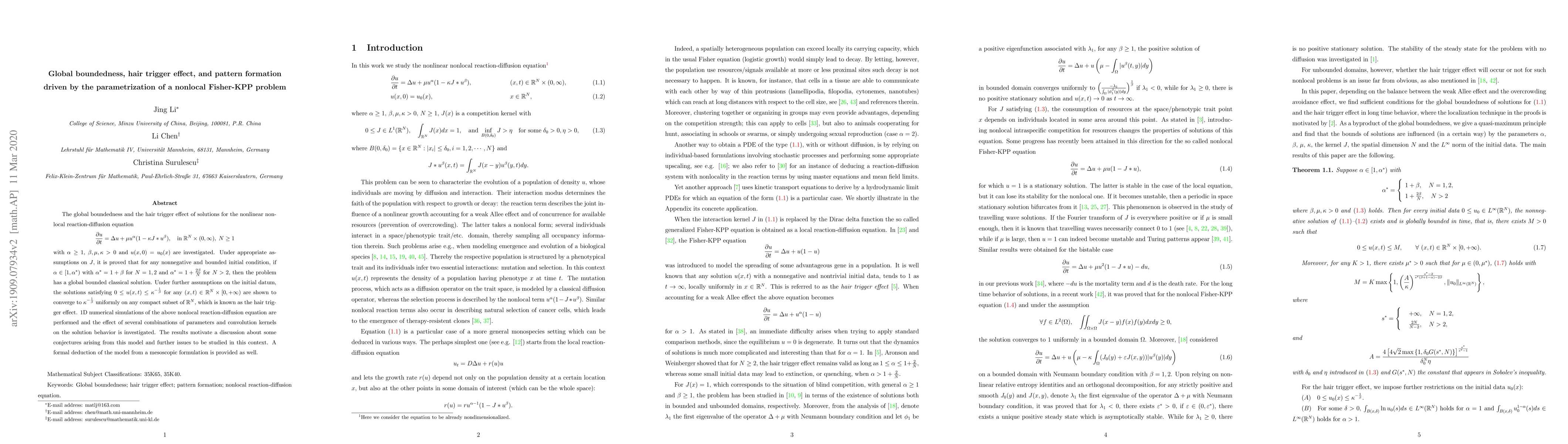 The global boundedness and the hair trigger effect of solutions for the nonlinear nonlocal reaction-diffusion equation \begin{align*} u_t=\Delta u+\mu u^\alpha(1-\kappa J*u^\beta),\quad\hbox{in} \;\mathbb R^N\times(0,\infty),\; N\geq 1 \end{align*} with $\alpha\geq1$, $\beta,\mu,\kappa>0$ and $u(x,0)=u_0(x)$ are investigated. Under appropriate assumptions on $J$, it is proved that for any nonnegative and bounded initial condition, if $\alpha\in[1,\alpha^*)$ with $\alpha^*=1+\beta$ for $N=1,2$ and $\alpha^*=1+\frac{2\beta}{N}$ for $N>2$, then the problem has a global bounded classical solution. Under further assumptions on the initial datum, the solutions satisfying $0\leq u(x,t)\leq\kappa^{-\frac1\beta}$ for any $(x,t)\in\mathbb R^N\times[0,+\infty)$ are shown to converge to $\kappa^{-\frac1\beta}$ uniformly on any compact subset of $\mathbb R^N$, which is known as the hair trigger effect. 1D numerical simulations of the above nonlocal reaction-diffusion equation are performed and the effect of several combinations of parameters and convolution kernels on the solution behavior is investigated. The results motivate a discussion about some conjectures arising from this model and further issues to be studied in this context. A formal deduction of the model from a mesoscopic formulation is provided as well.