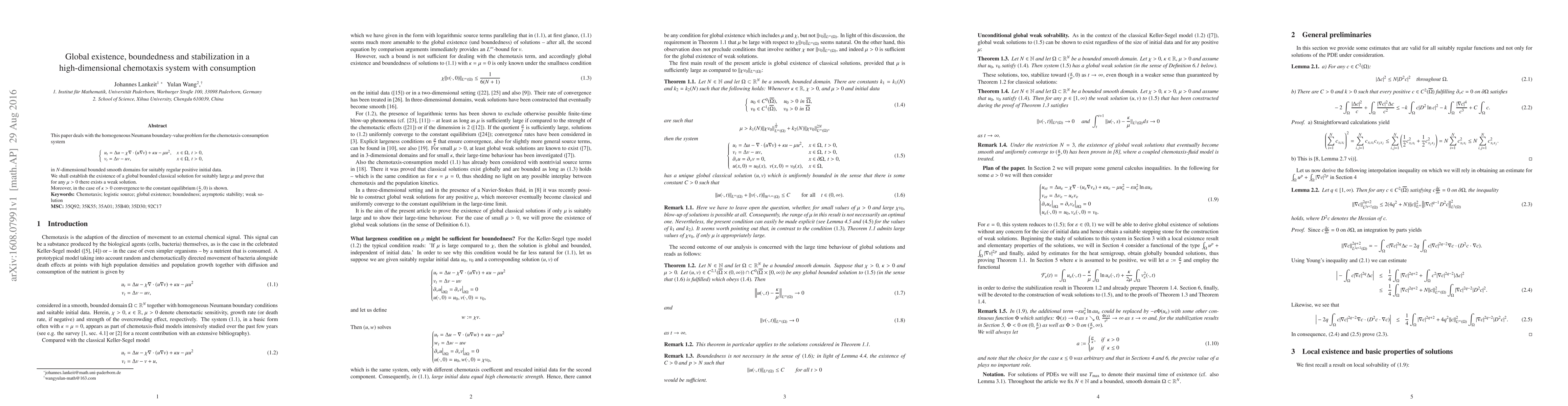 This paper investigates the global existence, boundedness, and stabilization of solutions for a high-dimensional chemotaxis system with consumption, establishing global bounded classical solutions for suitably large parameters and weak solutions for any positive parameters. It also proves convergence to a constant equilibrium under certain conditions.