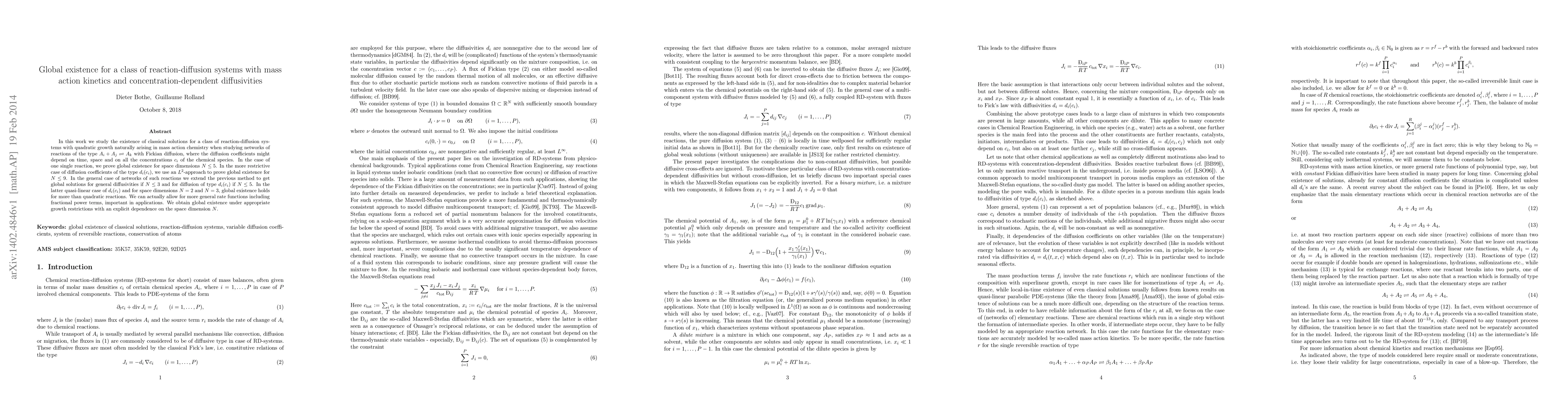 This paper investigates the global existence of classical solutions for reaction-diffusion systems arising in mass action chemistry, particularly focusing on networks of reactions with Fickian diffusion and concentration-dependent diffusivities. The study proves global existence under various conditions, including for dimensions $N \leq 5$ for single reactions and for $N \leq 9$ with specific diffusion types.