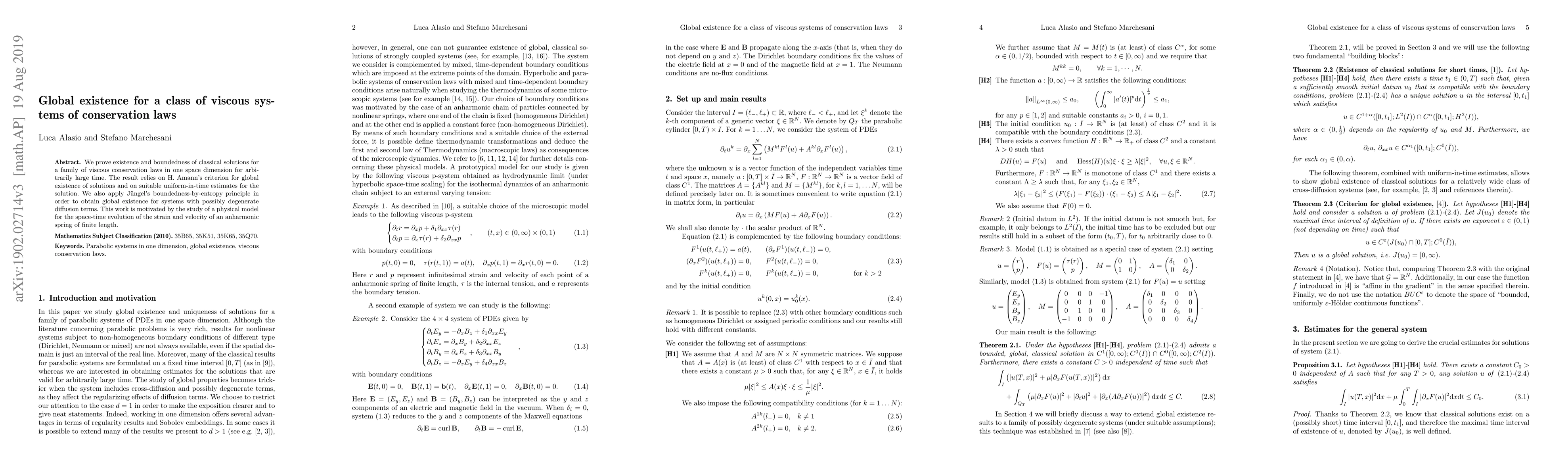 We prove existence and boundedness of classical solutions for a family of viscous conservation laws in one space dimension for arbitrarily large time. The result relies on H. Amann's criterion for global existence of solutions and on suitable uniform-in-time estimates for the solution. We also apply J\"ungel's boundedness-by-entropy principle in order to obtain global existence for systems with possibly degenerate diffusion terms. This work is motivated by the study of a physical model for the space-time evolution of the strain and velocity of an anharmonic spring of finite length.