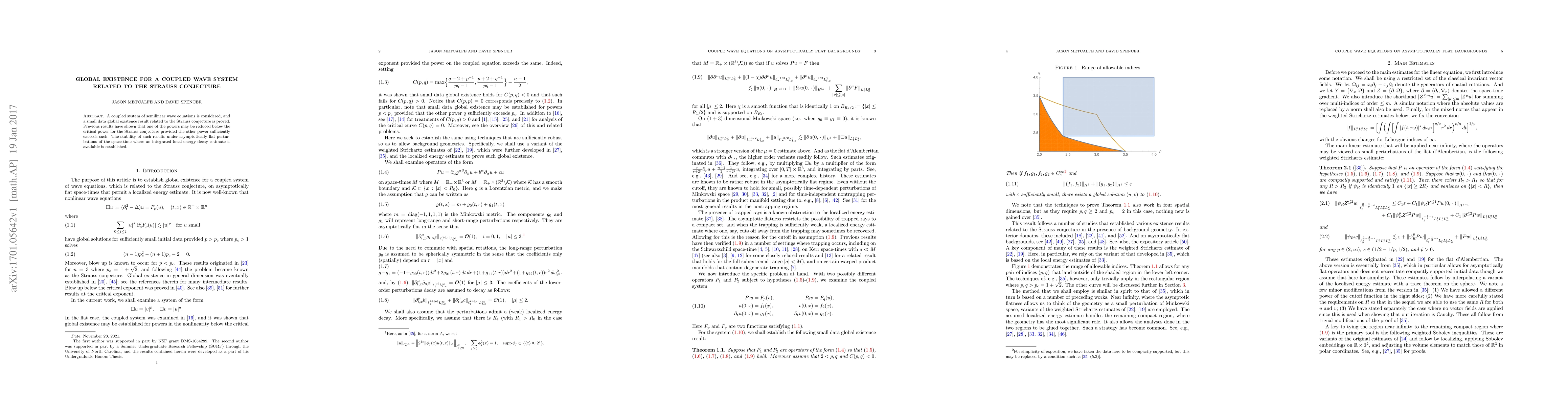 This paper proves global existence for a coupled system of semilinear wave equations under small data conditions, extending results related to the Strauss conjecture. It also establishes stability under asymptotically flat perturbations with an integrated local energy decay estimate.