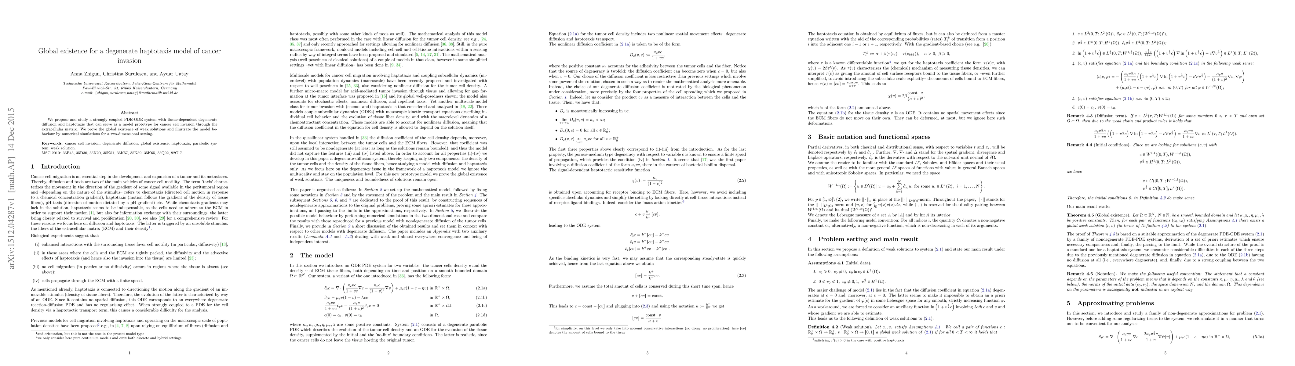 This paper proposes a PDE-ODE model for cancer cell invasion, featuring degenerate diffusion and haptotaxis. The authors prove global existence of weak solutions and demonstrate model behavior through numerical simulations in a two-dimensional setting.