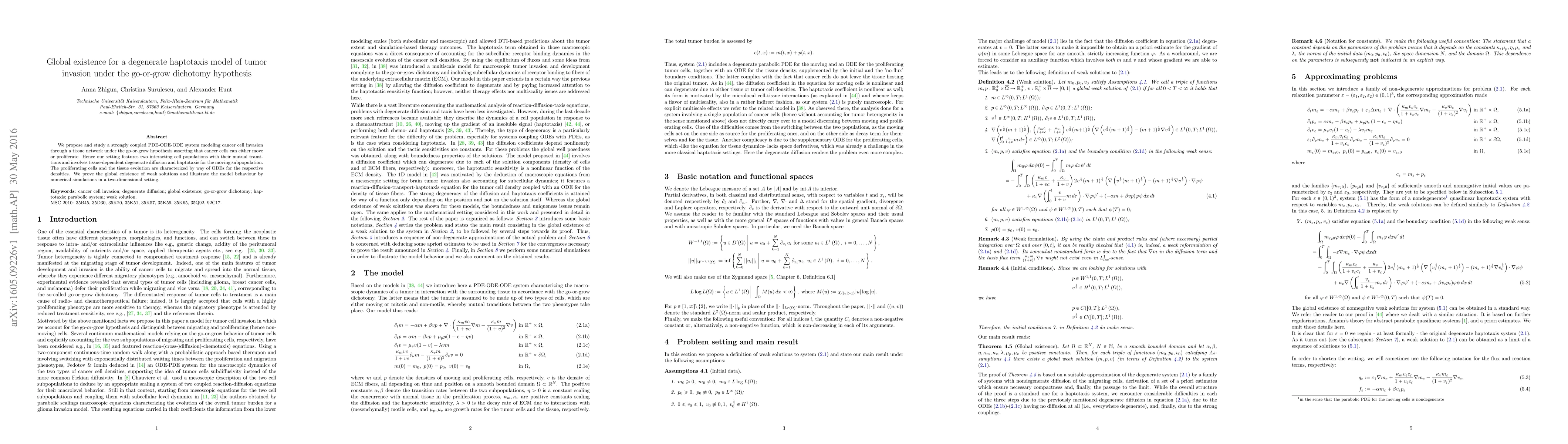 This paper proposes a PDE-ODE-ODE system to model cancer cell invasion under the go-or-grow hypothesis, featuring two cell populations with tissue-dependent degenerate diffusion and haptotaxis. The authors prove global existence of weak solutions and demonstrate model behavior via numerical simulations.