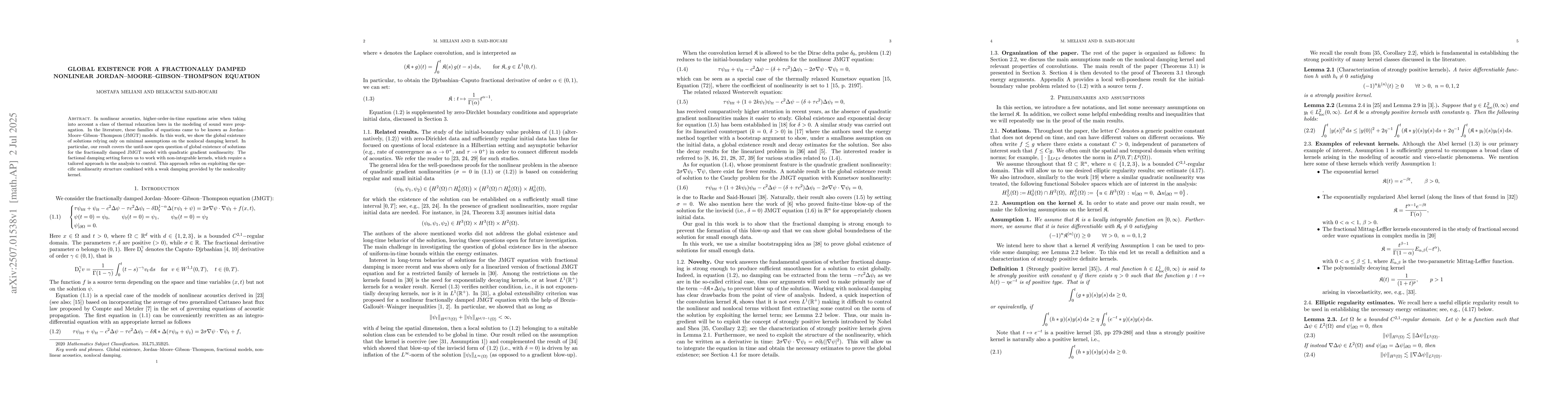 In nonlinear acoustics, higher-order-in-time equations arise when taking into account a class of thermal relaxation laws in the modeling of sound wave propagation. In the literature, these families of equations came to be known as Jordan--Moore--Gibson--Thompson (JMGT) models. In this work, we show the global existence of solutions relying only on minimal assumptions on the nonlocal damping kernel. In particular, our result covers the until-now open question of global existence of solutions for the fractionally damped JMGT model with quadratic gradient nonlinearity. The factional damping setting forces us to work with non-integrable kernels, which require a tailored approach in the analysis to control. This approach relies on exploiting the specific nonlinearity structure combined with a weak damping provided by the nonlocality kernel.