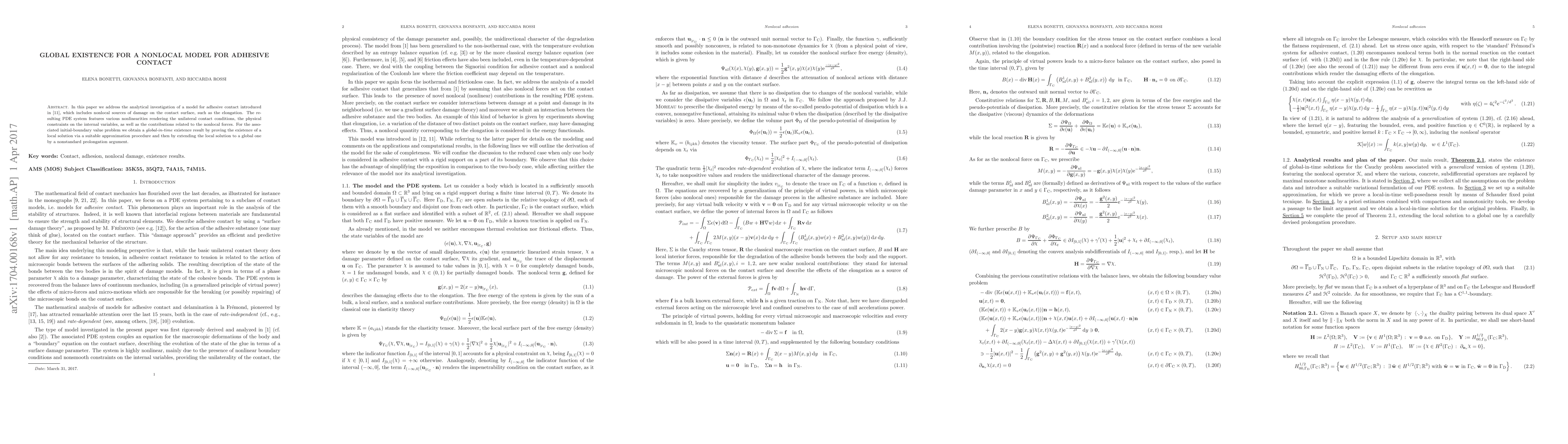Researchers prove global existence for a mathematical model of adhesive contact that includes nonlocal sources of damage, showing that the model can sustain contact over time.
