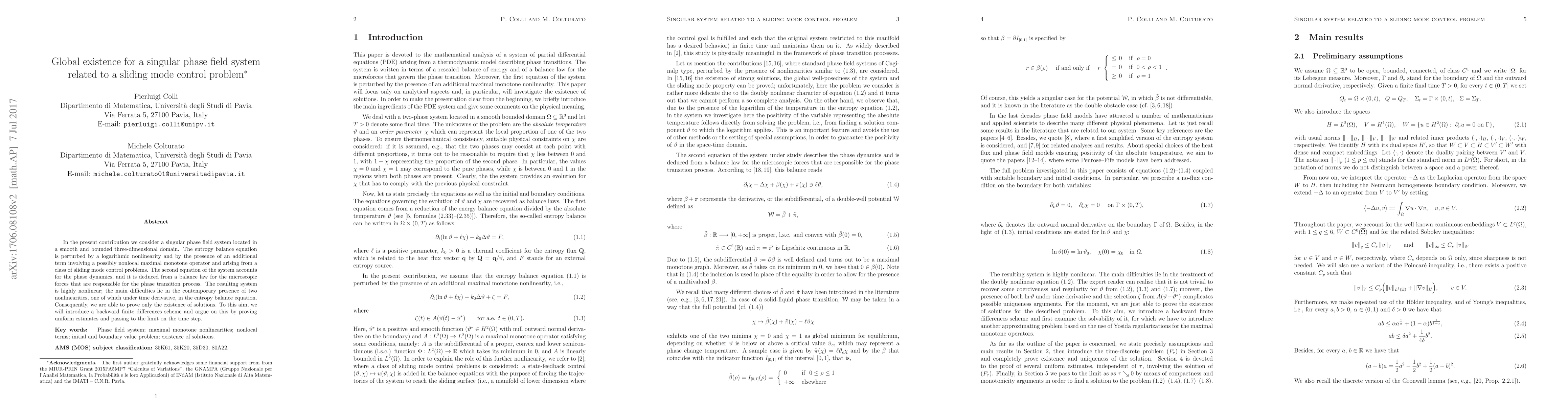This paper investigates the global existence of solutions for a singular phase field system with a logarithmic nonlinearity and a nonlocal maximal monotone operator, arising from sliding mode control problems. The authors establish existence by introducing a backward finite differences scheme and proving uniform estimates before taking the limit.