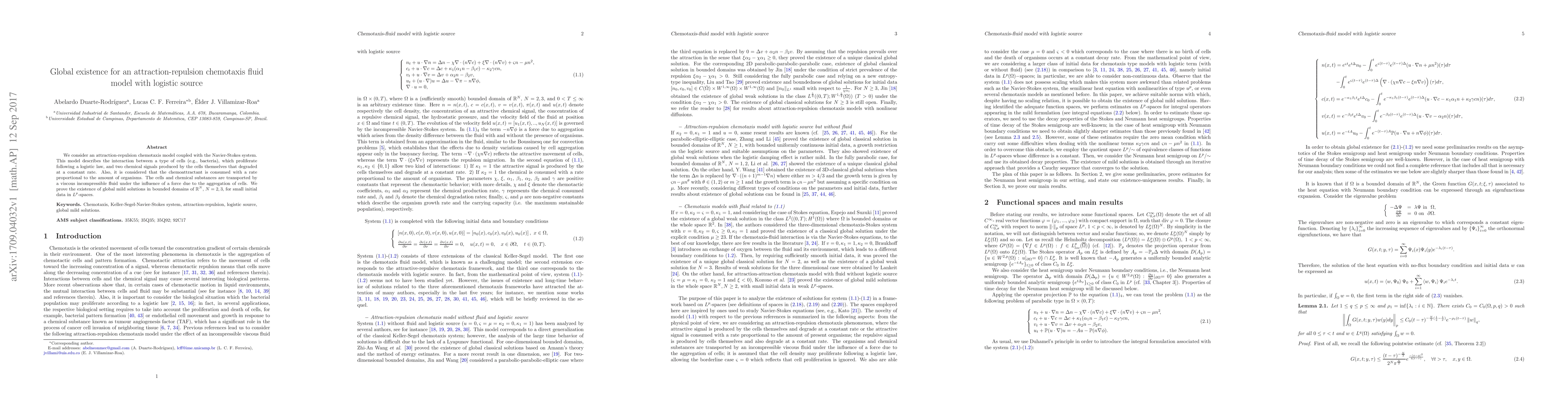 This paper proves global existence of mild solutions for a chemotaxis fluid model with attraction-repulsion dynamics, coupled Navier-Stokes flow, and logistic growth of cells. The model accounts for logistic proliferation, degradation of chemical signals, and fluid transport, establishing results for small initial data in Lp-spaces.