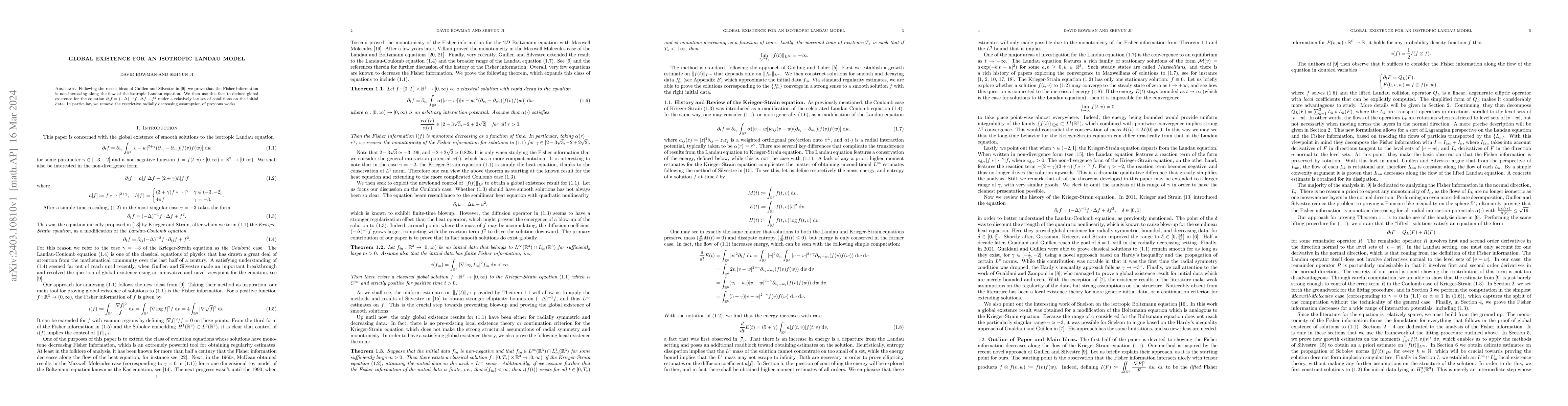 Summary: This paper demonstrates that the Fisher information remains non-increasing during the isotropic Landau equation's flow, leading to global existence of solutions under less restrictive initial conditions than previously required.