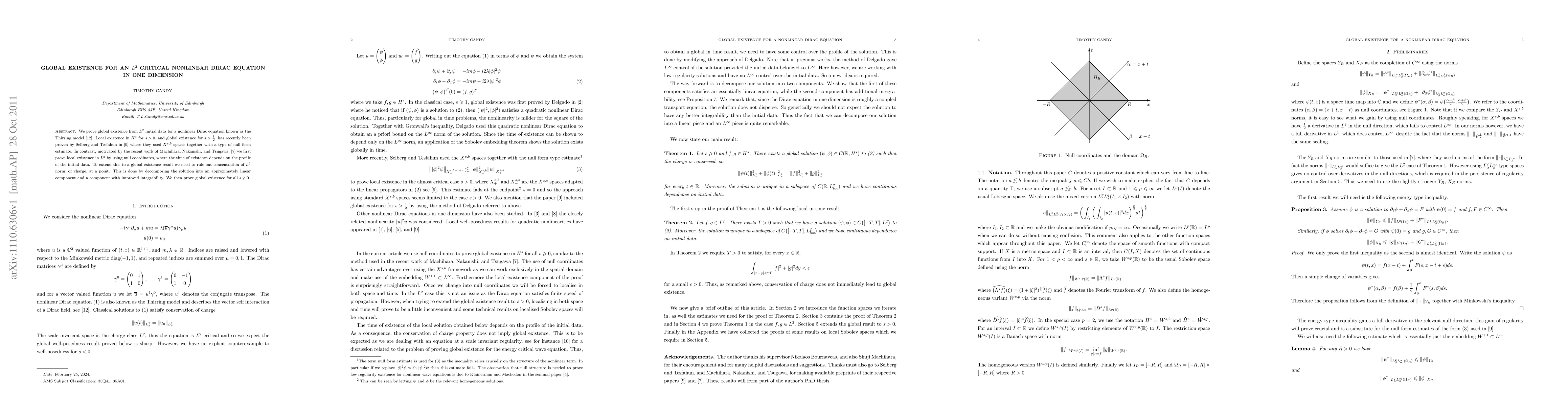 This paper proves global existence for the nonlinear Dirac equation (Thirring model) from $L^2$ initial data in one dimension. Unlike previous works, it establishes local existence in $L^2$ using null coordinates and extends this to global existence by decomposing the solution into manageable components to prevent concentration of $L^2$ charge.