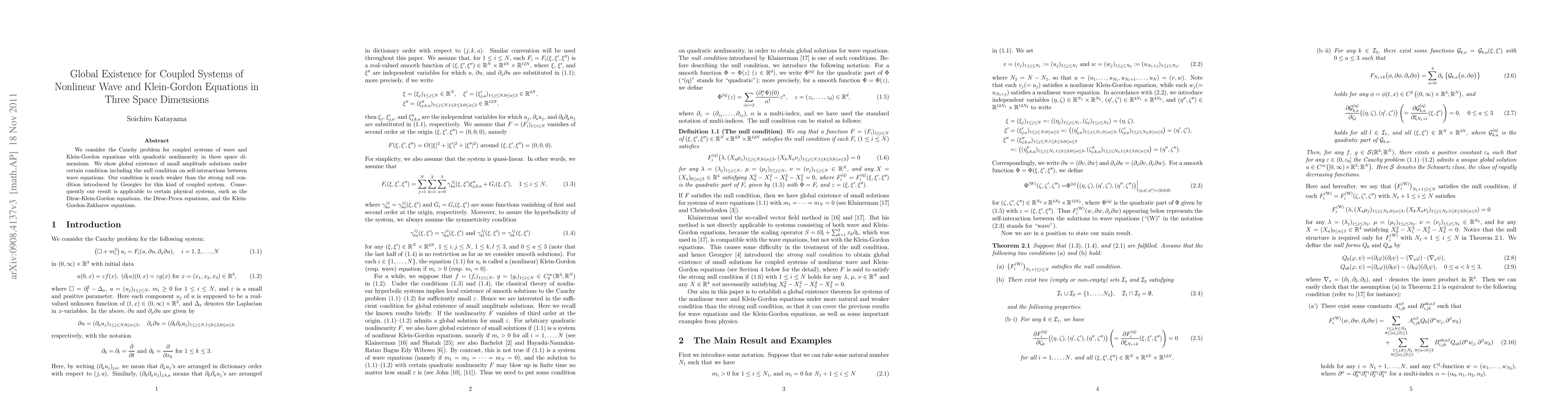 This paper proves global existence of small amplitude solutions for coupled nonlinear wave and Klein-Gordon equations in three dimensions under a weaker condition than previously established, applicable to systems like Dirac-Klein-Gordon and Klein-Gordon-Zakharov. The key is a less restrictive null condition on wave self-interactions.