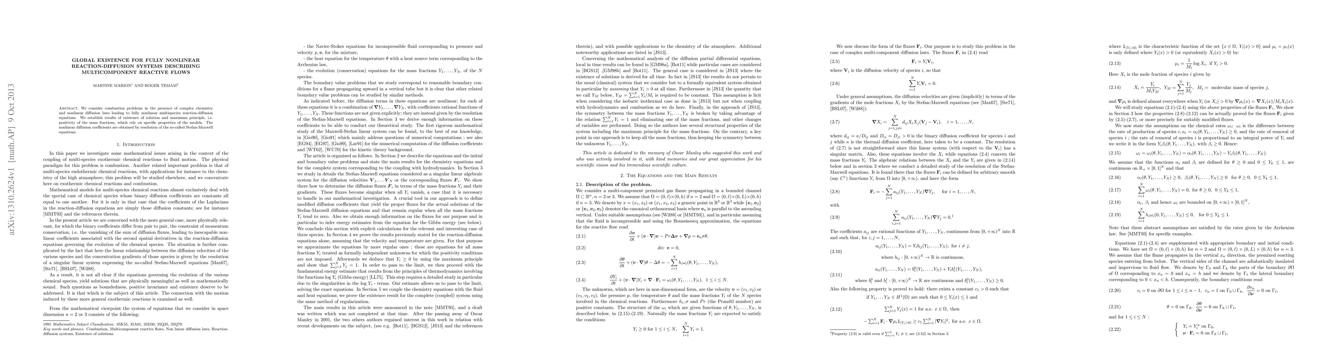 We consider combustion problems in the presence of complex chemistry and nonlinear diffusion laws leading to fully nonlinear multispecies reaction-diffusion equations. We establish results of existence of solution and maximum principle, i.e. positivity of the mass fractions, which rely on specific properties of the models. The nonlinear diffusion coefficients are obtained by resolution of the so-called Stefan-Maxwell equations.