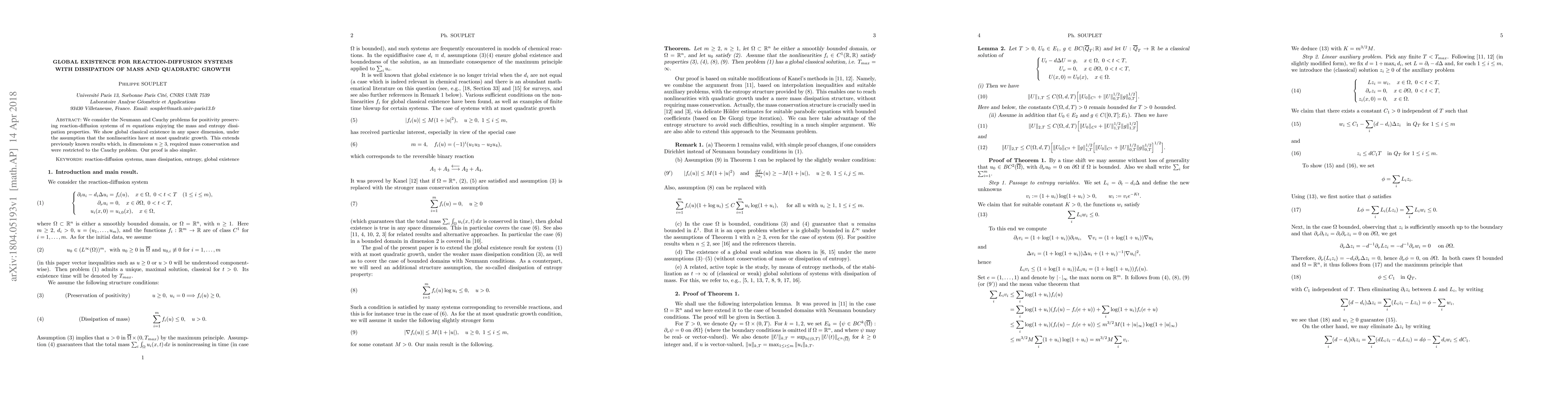 This paper establishes global classical existence for reaction-diffusion systems with mass dissipation and quadratic growth, extending previous results that required mass conservation and were limited to the Cauchy problem in higher dimensions. The proof is simpler and applies to both Neumann and Cauchy problems in any space dimension.