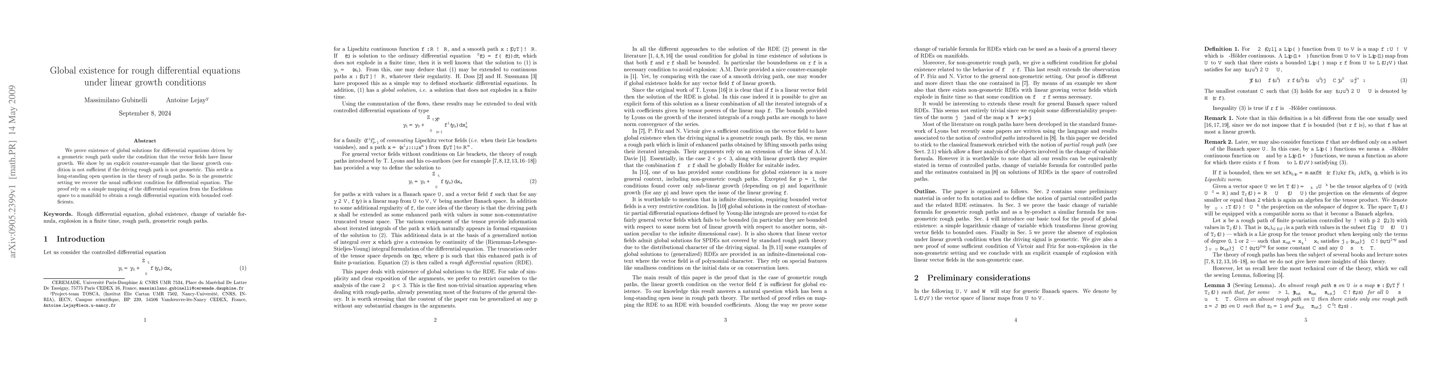 This paper proves global existence for differential equations driven by a geometric rough path when vector fields exhibit linear growth. It demonstrates that linear growth is insufficient without the geometric condition, resolving a longstanding question in rough path theory. The proof involves mapping the equation from Euclidean space to a manifold for bounded coefficients.