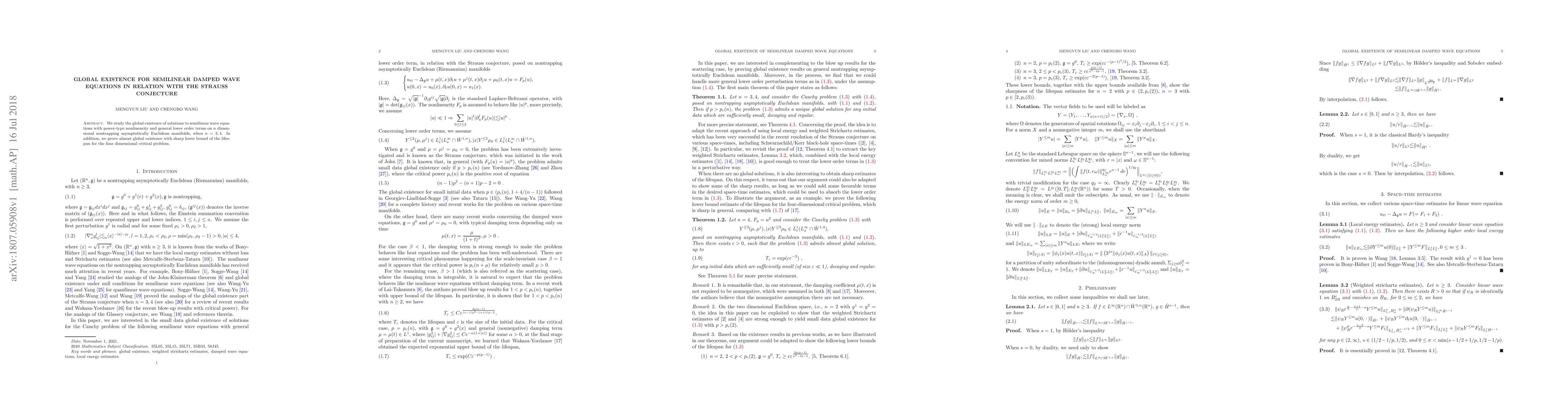 This paper investigates the global existence of solutions to semilinear damped wave equations with power-type nonlinearity on three and four-dimensional asymptotically Euclidean manifolds, proving almost global existence with a sharp lower bound for the four-dimensional critical case. The study relates to the Strauss conjecture in the context of these equations.