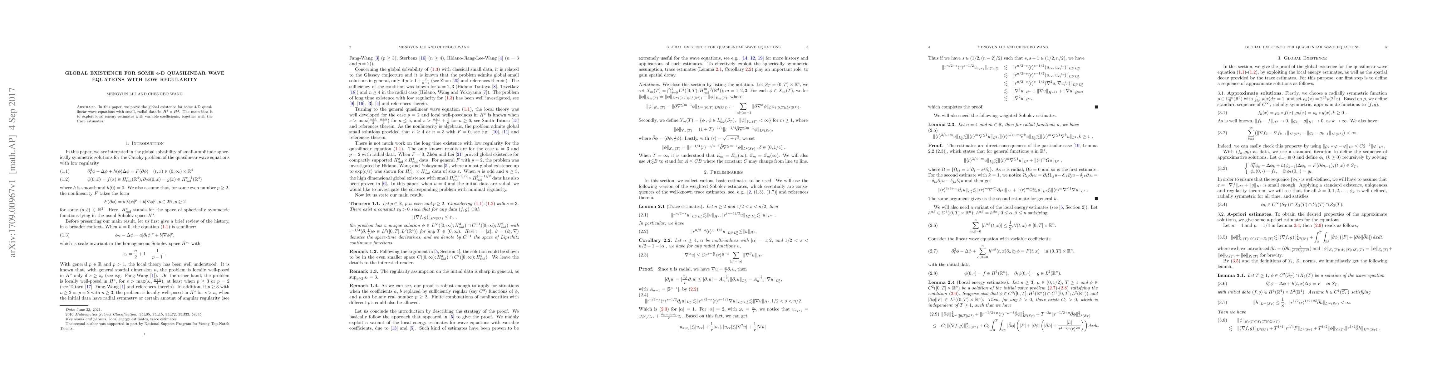 In this paper, we prove the global existence for some 4-D quasilinear wave equations with small, radial data in $H^{3}\times H^{2}$. The main idea is to exploit local energy estimates with variable coefficients, together with the trace estimates.