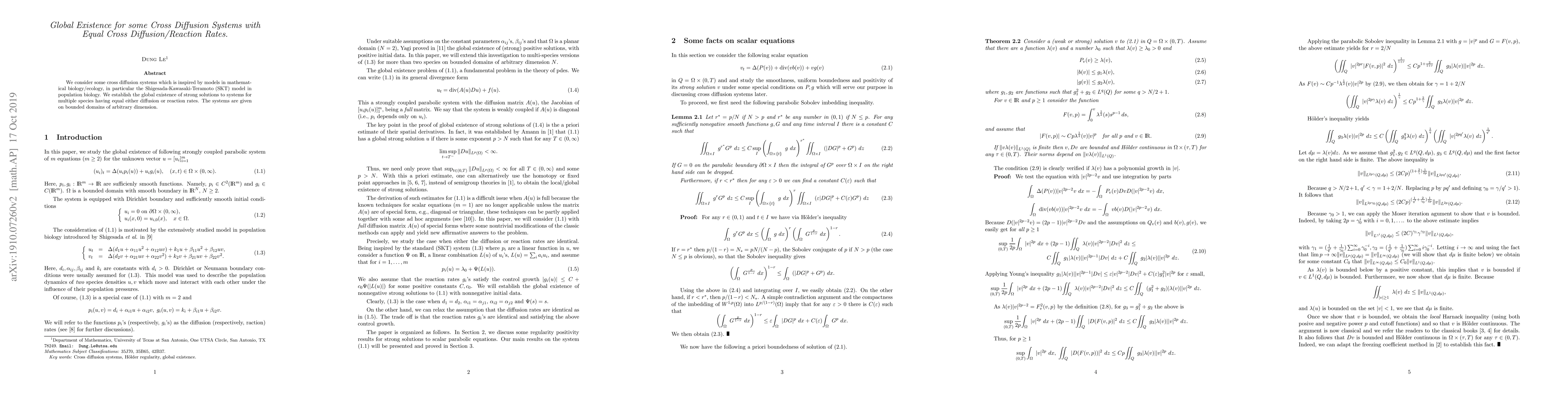 We consider some cross diffusion systems which is inspired by models in mathematical biology/ecology, in particular the Shigesada-Kawasaki-Teramoto (SKT) model in population biology. We establish the global existence of strong solutions to systems for multiple species having equal either diffusion or reaction rates. The systems are given on bounded domains of arbitrary dimension.