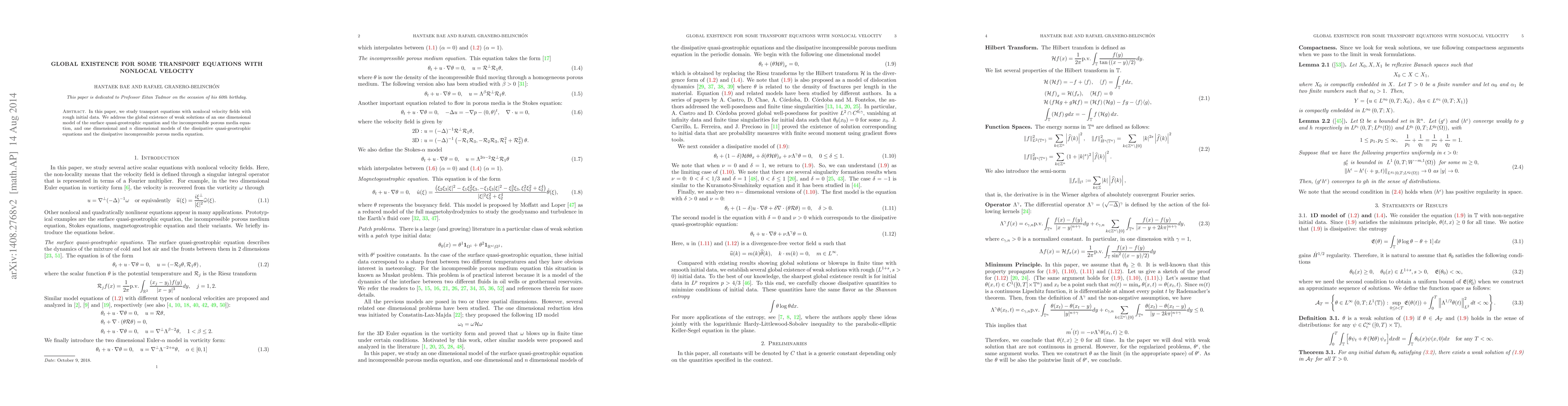 This paper investigates the global existence of weak solutions for transport equations featuring nonlocal velocity fields, focusing on one-dimensional models of the surface quasi-geostrophic and porous media equations, as well as their dissipative variants in both one and higher dimensions.