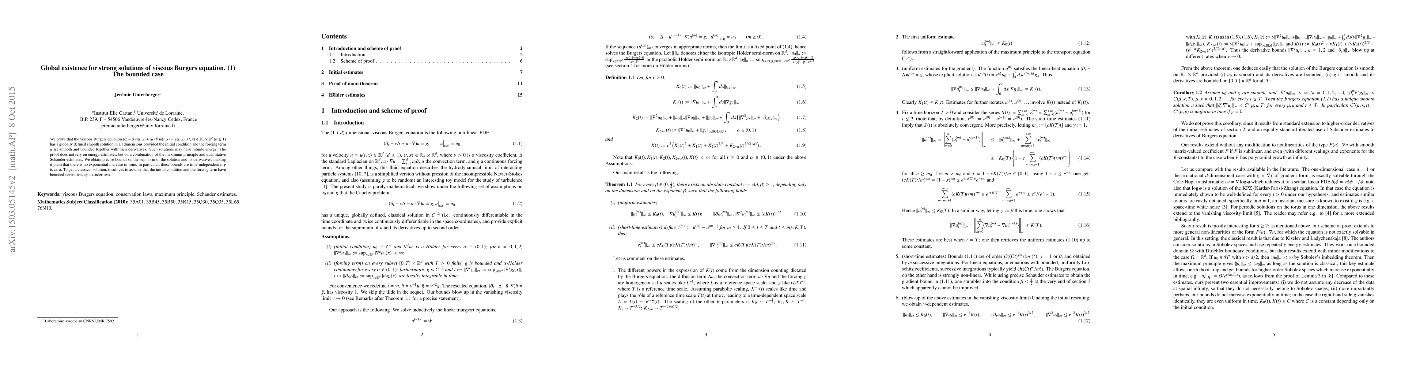 We prove that the viscous Burgers equation has a globally defined smooth solution in all dimensions provided the initial condition and the forcing term are smooth and bounded together with their derivatives. Such solutions may have infinite energy. The proof does not rely on energy estimates, but on a combination of the maximum principle and quantitative Schauder estimates. We obtain precise bounds on the sup norm of the solution and its derivatives, making it plain that there is no exponential increase in time. In particular, these bounds are time-independent if the forcing term is zero. To get a classical solution, it suffices to assume that the initial condition and the forcing term have bounded derivatives up to order two.