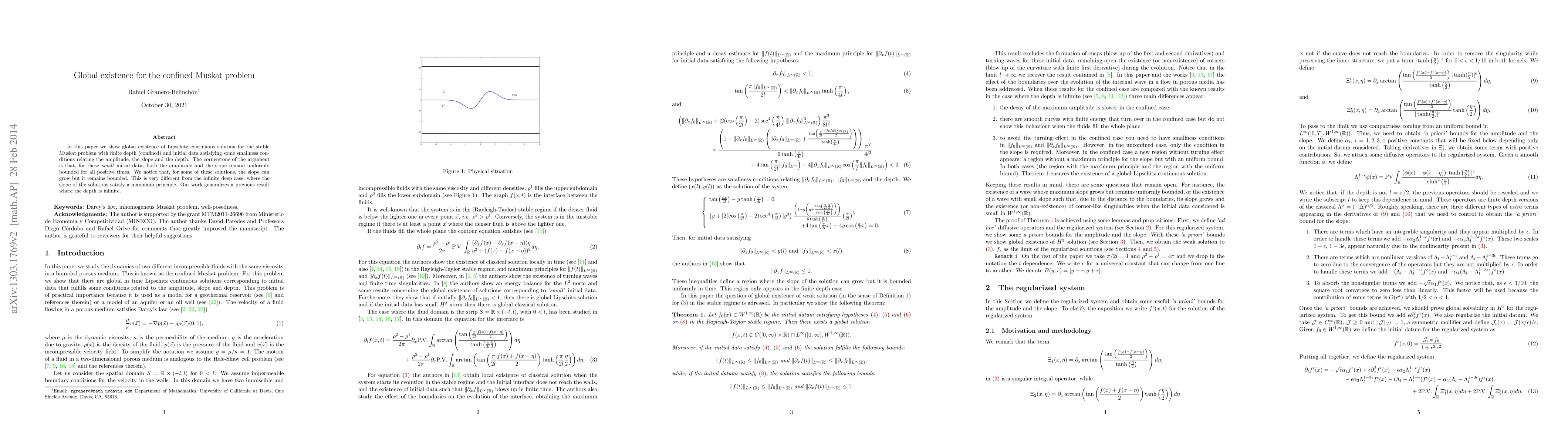This paper demonstrates global existence of Lipschitz continuous solutions for the confined Muskat problem under small initial data conditions. The key finding is that both amplitude and slope remain uniformly bounded over time, contrasting with the infinite depth case where slopes follow a maximum principle.
