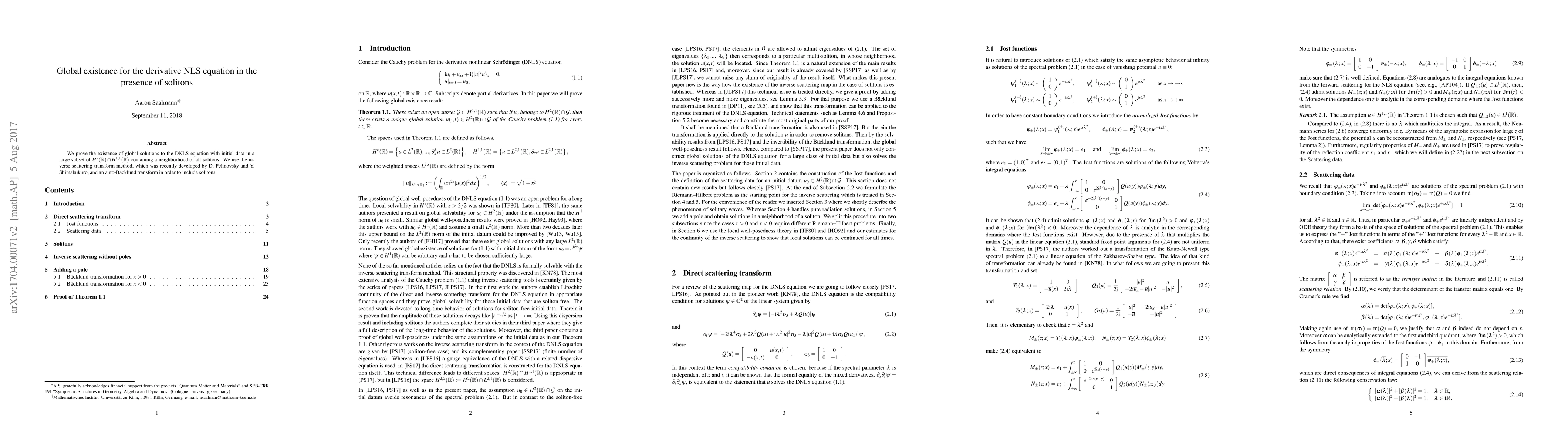 We prove the existence of global solutions to the DNLS equation with initial data in a large subset of $H^2(\mathbb R)\cap H^{1,1}(\mathbb R)$ containing a neighborhood of all solitons. We use the inverse scattering transform method, which was recently developed by D. Pelinovsky and Y. Shimabukuro, and an auto-B\"acklund transform in order to include solitons.