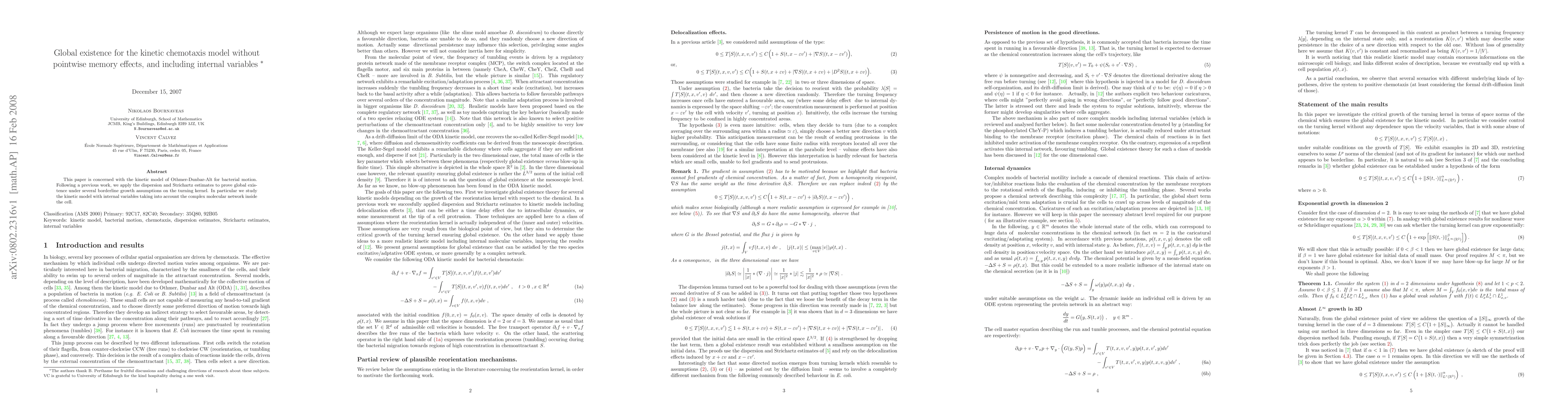 This paper is concerned with the kinetic model of Othmer-Dunbar-Alt for bacterial motion. Following a previous work, we apply the dispersion and Strichartz estimates to prove global existence under several borderline growth assumptions on the turning kernel. In particular we study the kinetic model with internal variables taking into account the complex molecular network inside the cell.