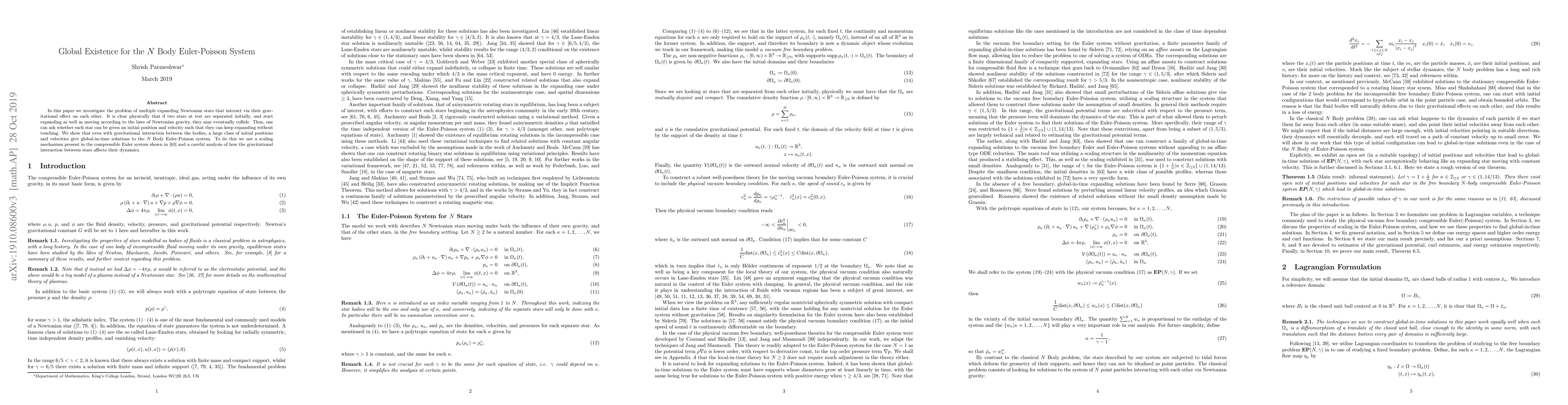 A study shows that a large class of initial positions and velocities allow N-body stars to expand without colliding in the presence of gravitational interaction, providing global-in-time solutions to the Euler-Poisson system.