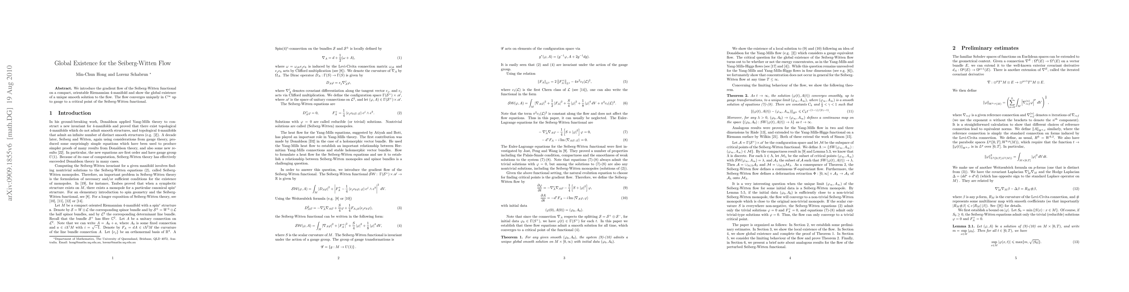 Researchers prove the global existence of a unique solution to the Seiberg-Witten flow on compact 4-manifolds, which converges uniquely to a critical point of the functional.