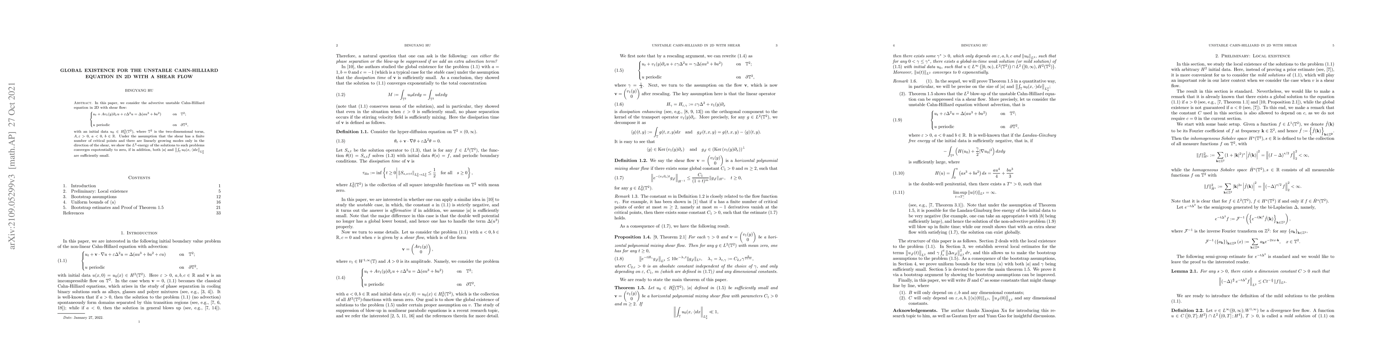 In this paper, we consider the advective unstable Cahn-Hilliard equation in 2D with shear flow: \begin{equation*} \begin{cases} u_t+Av_1(y) \partial_x u+\varepsilon \Delta^2 u= \Delta(a u^3+ b u^2) \quad & \quad \textrm{on} \quad \mathbb T^2; \\ \\ u \ \textrm{periodic} \quad & \quad \textrm{on} \quad \partial \mathbb T^2, \end{cases} \end{equation*} with an initial data $u_0 \in H_0^2(\mathbb T^2)$, where $\mathbb T^2$ is the two-dimensional torus, $A, \varepsilon>0$, $a<0$, $b \in \mathbb R$. Under the assumption that the shear has a finite number of critical points and there are linearly growing modes only in the direction of the shear, we show the $L^2$-energy of the solutions to such problems converges expotentially to zero, if in addition, both $|a|$ and $\left\| \int_{\mathbb T} u_0(x, \cdot ) dx \right\|_{L_y^2}$ are sufficiently small.