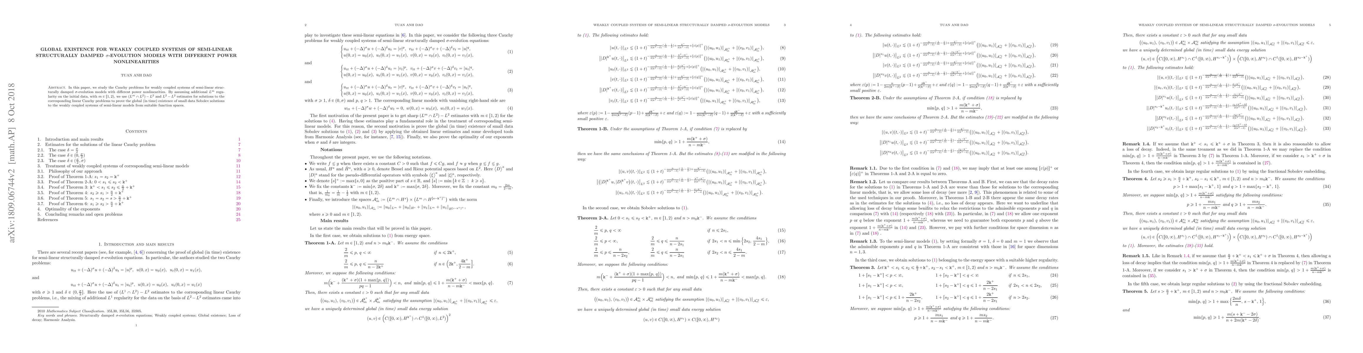 In this paper, we study the Cauchy problems for weakly coupled systems of semi-linear structurally damped $\sigma$-evolution models with different power nonlinearities. By assuming additional $L^m$ regularity on the initial data, with $m \in [1,2)$, we use $(L^m \cap L^2)- L^2$ and $L^2- L^2$ estimates for solutions to the corresponding linear Cauchy problems to prove the global (in time) existence of small data Sobolev solutions to the weakly coupled systems of semi-linear models from suitable function spaces.