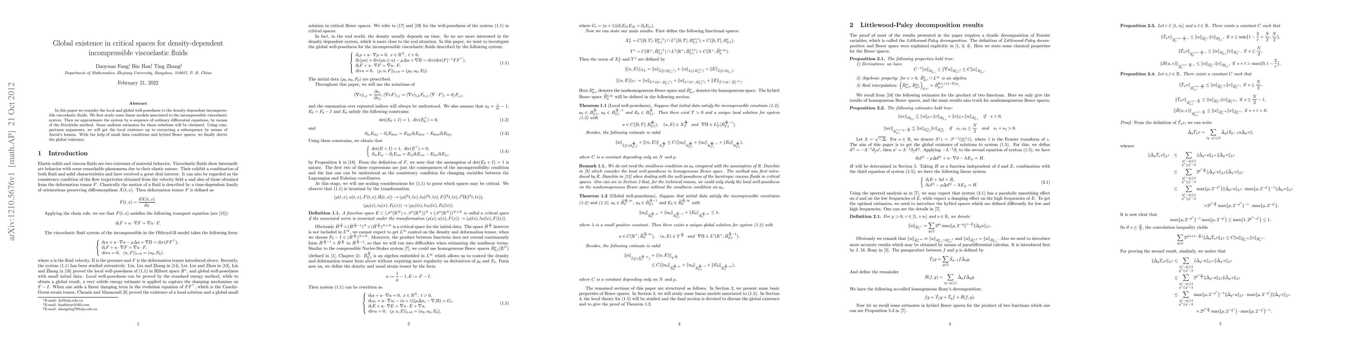 This paper investigates the local and global existence of solutions for density-dependent incompressible viscoelastic fluids. It employs linear models and Friedrichs approximation, followed by compactness arguments and small data conditions to establish global existence in critical spaces.