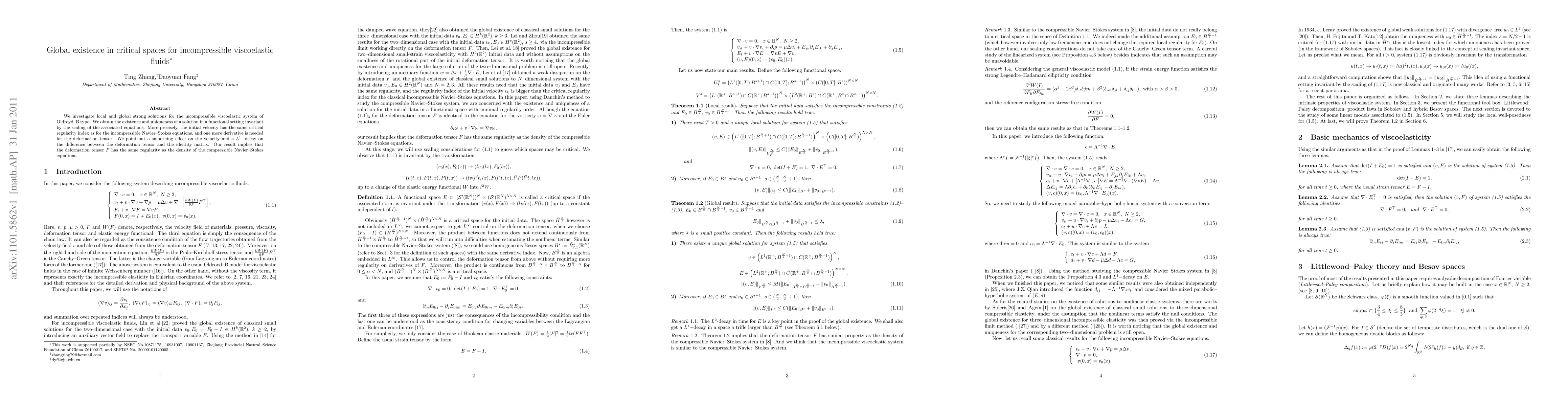 This paper investigates the existence and uniqueness of strong solutions for incompressible viscoelastic fluids modeled by the Oldroyd-B system, establishing global existence in critical spaces. The study highlights a smoothing effect on the velocity and a $L^1$-decay on the deformation tensor, aligning the regularity of the deformation tensor with that of the compressible Navier-Stokes equations.