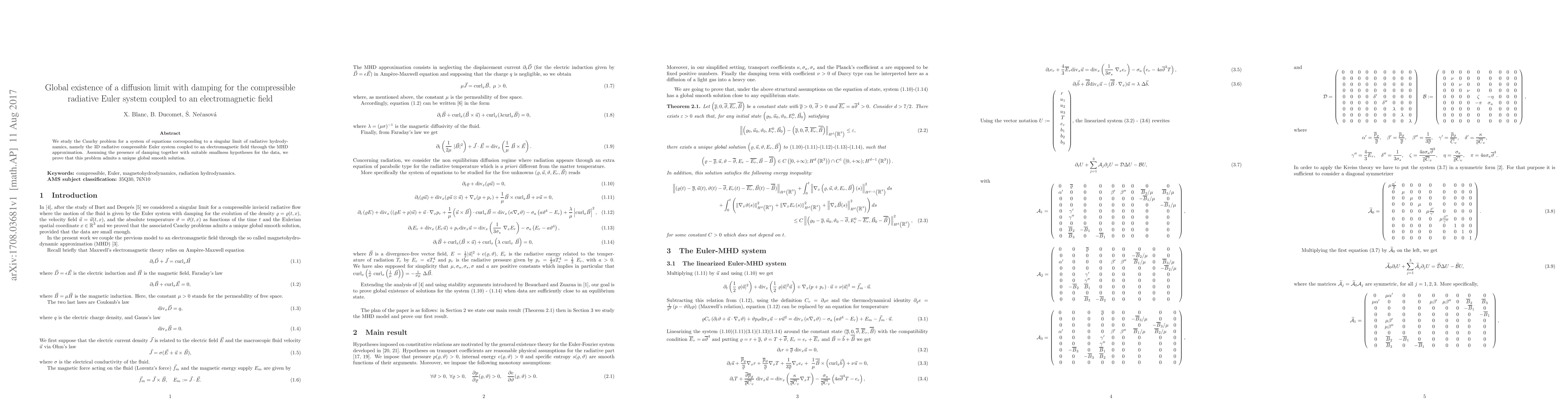 We study the Cauchy problem for a system of equations corresponding to a singular limit of radiative hydrodynamics, namely the 3D radiative compressible Euler system coupled to an electromagnetic field through the MHD approximation. Assuming the presence of damping together with suitable smallness hypotheses for the data, we prove that this problem admits a unique global smooth solution.
