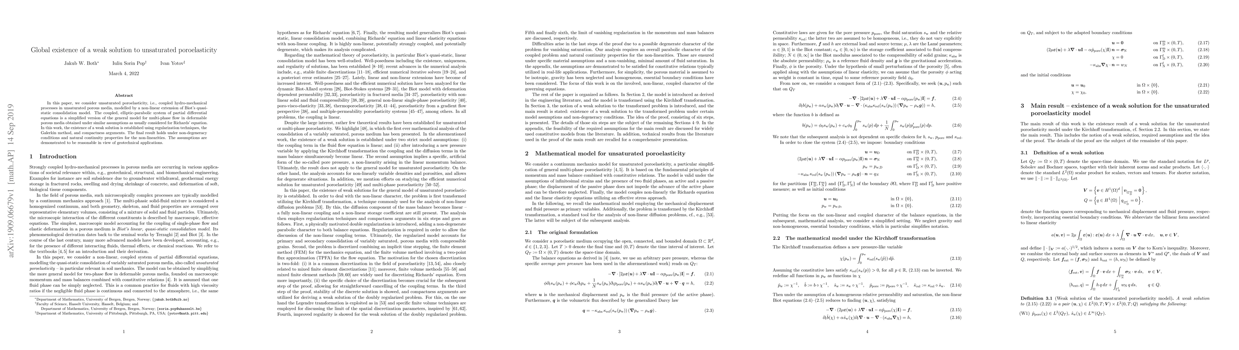 This paper establishes the global existence of a weak solution for unsaturated poroelasticity, modeled by a non-linear extension of Biot's consolidation model. The study utilizes regularization techniques, the Galerkin method, and compactness arguments to achieve the result under non-degeneracy conditions and natural continuity properties.