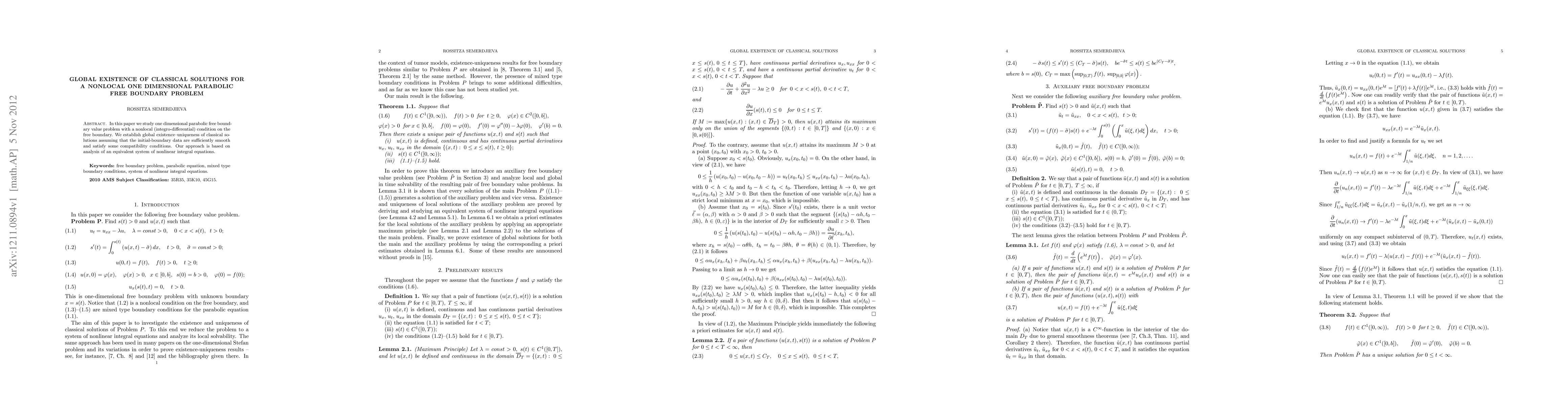 Summary: This paper establishes global existence and uniqueness of classical solutions for a one-dimensional parabolic free boundary problem with a nonlocal condition, using an equivalent system of nonlinear integral equations and assuming smooth initial-boundary data with compatibility conditions.