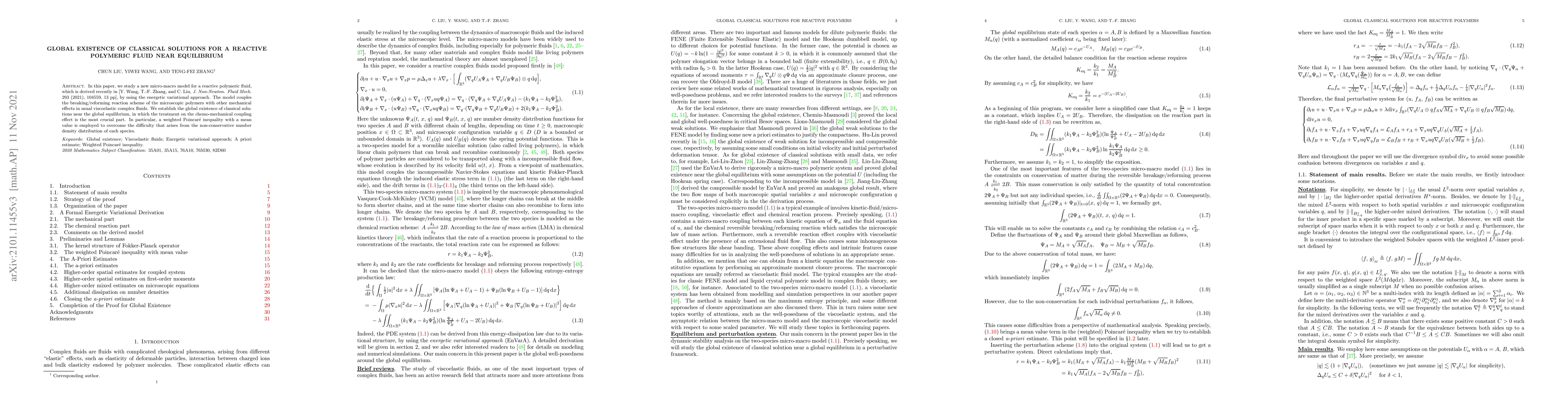 In this paper, we study a new micro-macro model for a reactive polymeric fluid, which is derived recently in [Y. Wang, T.-F. Zhang, and C. Liu, \emph{J. Non-Newton. Fluid Mech.} 293 (2021), 104559, 13 pp], by using the energetic variational approach. The model couples the breaking/reforming reaction scheme of the microscopic polymers with other mechanical effects in usual viscoelastic complex fluids. We establish the global existence of classical solutions near the global equilibrium, in which the treatment on the chemo-mechanical coupling effect is the most crucial part. In particular, a weighted Poincar\'e inequality with a mean value is employed to overcome the difficulty that arises from the non-conservative number density distribution of each species.