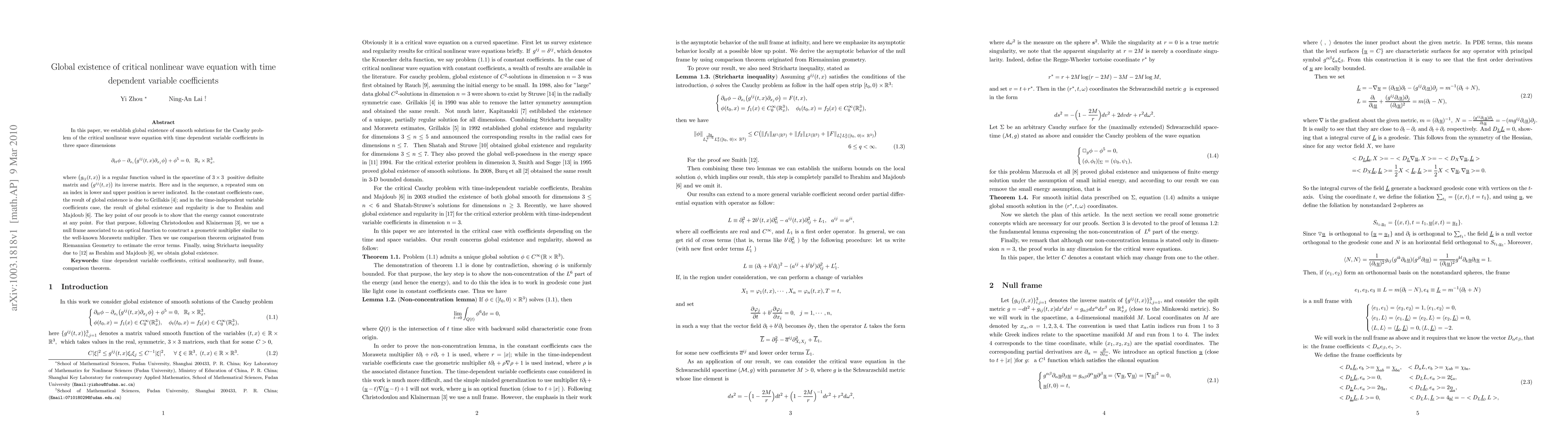 This paper establishes global existence of smooth solutions for the Cauchy problem of a critical nonlinear wave equation with time-dependent variable coefficients in three dimensions. The key proof technique involves constructing a geometric multiplier using a null frame and an optical function, followed by the application of Strichartz inequalities to achieve global existence.